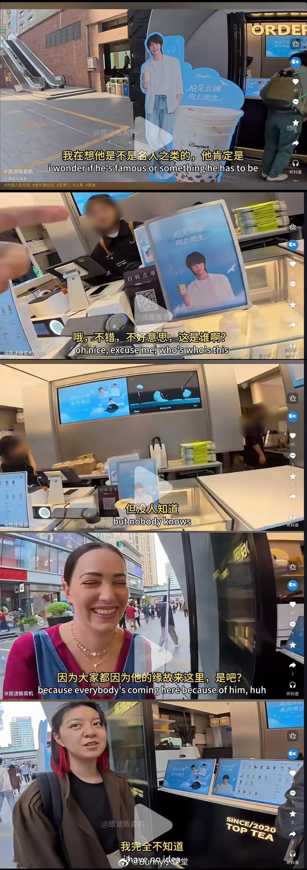 一个外国博主在奶茶店问门口的立牌代言人是谁,结果无人知晓,周围熙熙攘攘没有人能给