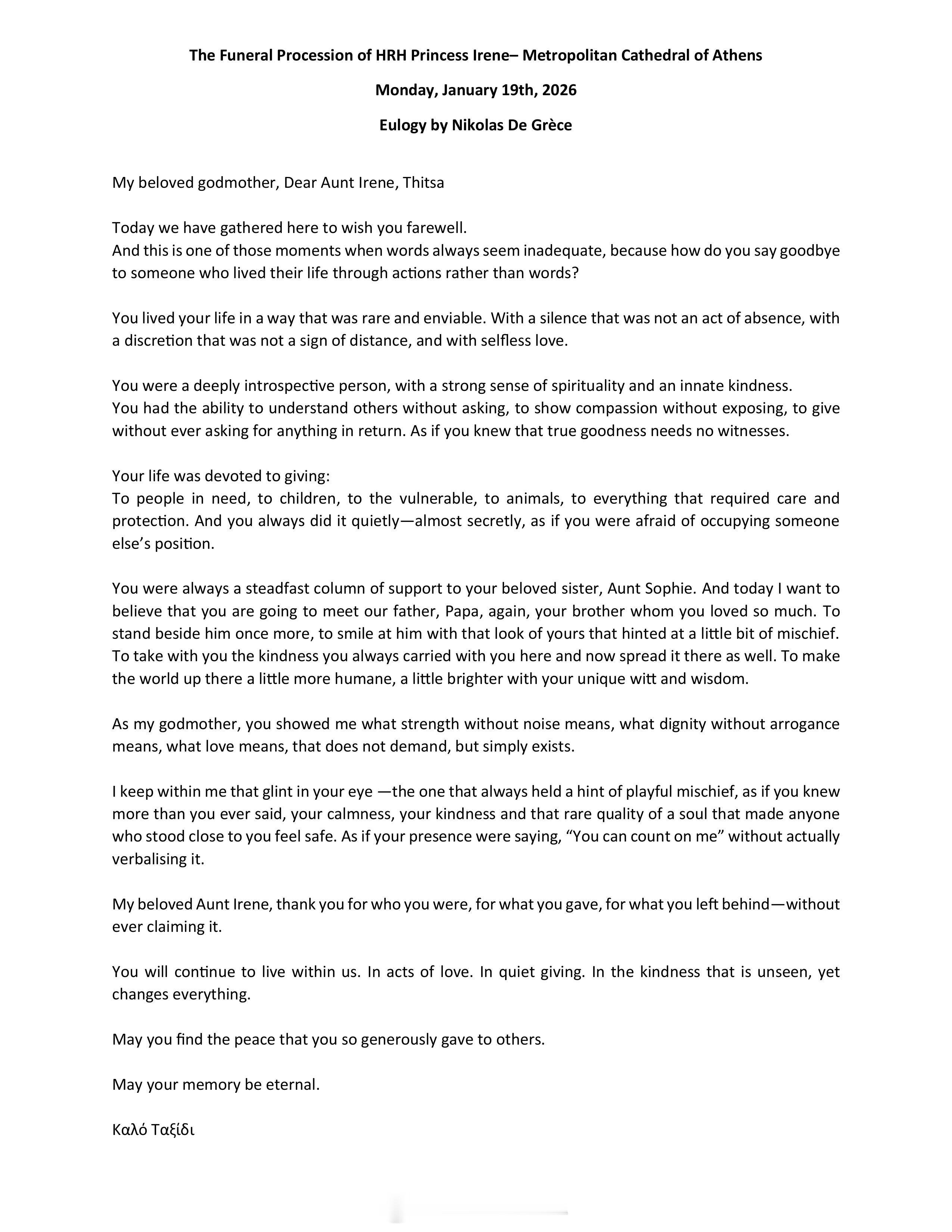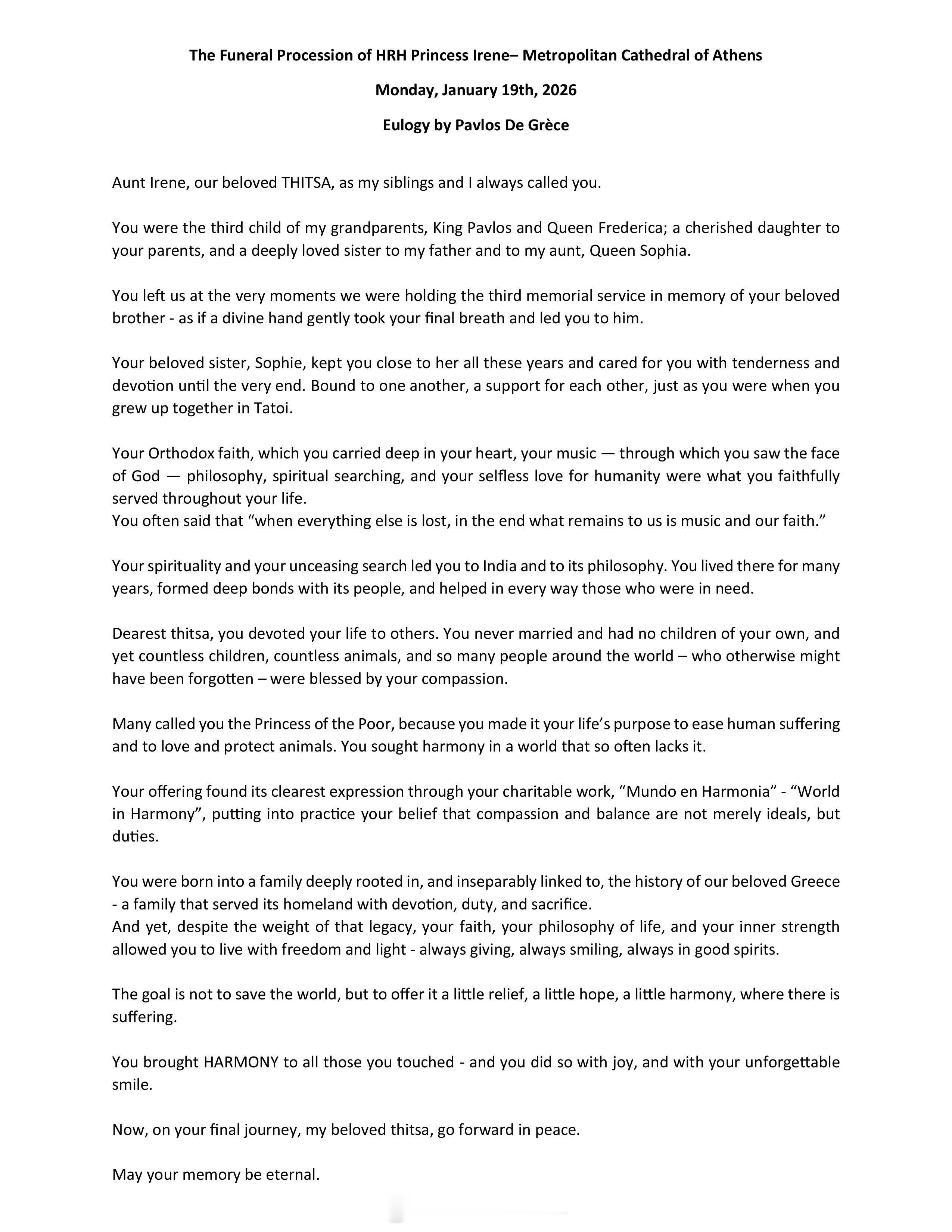 2026年1月19日,帕夫洛斯和尼古拉斯在希腊雅典的大都会大教堂上致敬他们的姑姑艾琳公主。帕夫洛斯开头就称呼艾琳是Thitsa:你是我的爷爷保罗国王和奶奶费雷德里卡王后的第三个孩子,你父母珍惜的女儿,我父亲和我姑妈索菲亚太上王后最深爱的妹妹。就在我们正在为你深爱的哥哥举办第三次追悼会的时候,你离开了我们,仿佛有一只神圣的手轻轻地拿走了你最后一口气,把你带到他身边。