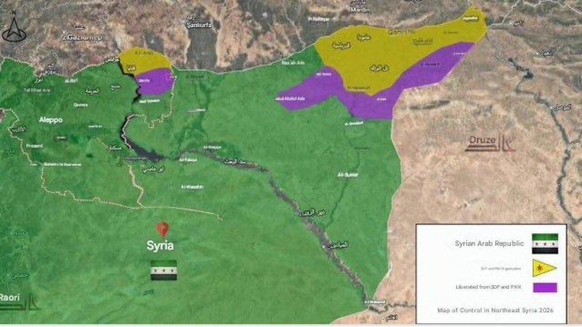 ❗这是目前“叙利亚民主力量-人民保护部队”的控制区(该图目前可能已经过时)(图1)朱拉尼政权目前宣布与“叙利亚民主力量”就哈塞克省的未来达成所谓“联合谅解”。要点:“叙利亚民主力量”有四天时间进行磋商并提交详细的整合计划。朱拉尼政权武装不会进入哈塞克、卡米什利市中心,而是留在郊区。也没有进驻库尔德村庄;只有当地安全部队。马兹卢姆·阿卜迪将提名“国防部”副部长、哈塞克省省长、议会代表和国家雇员的候选人。“叙利亚民主力量”的所有军事和安全部队将并入“国防部”和“内政部”;民事机关将加入国家政治结构。关于库尔德语言、文化和公民权利的“第13号法令”将予以实施。实施工作于今天晚上8点(当地时间)开始。玻利瓦尔英雄之地叙利亚局势