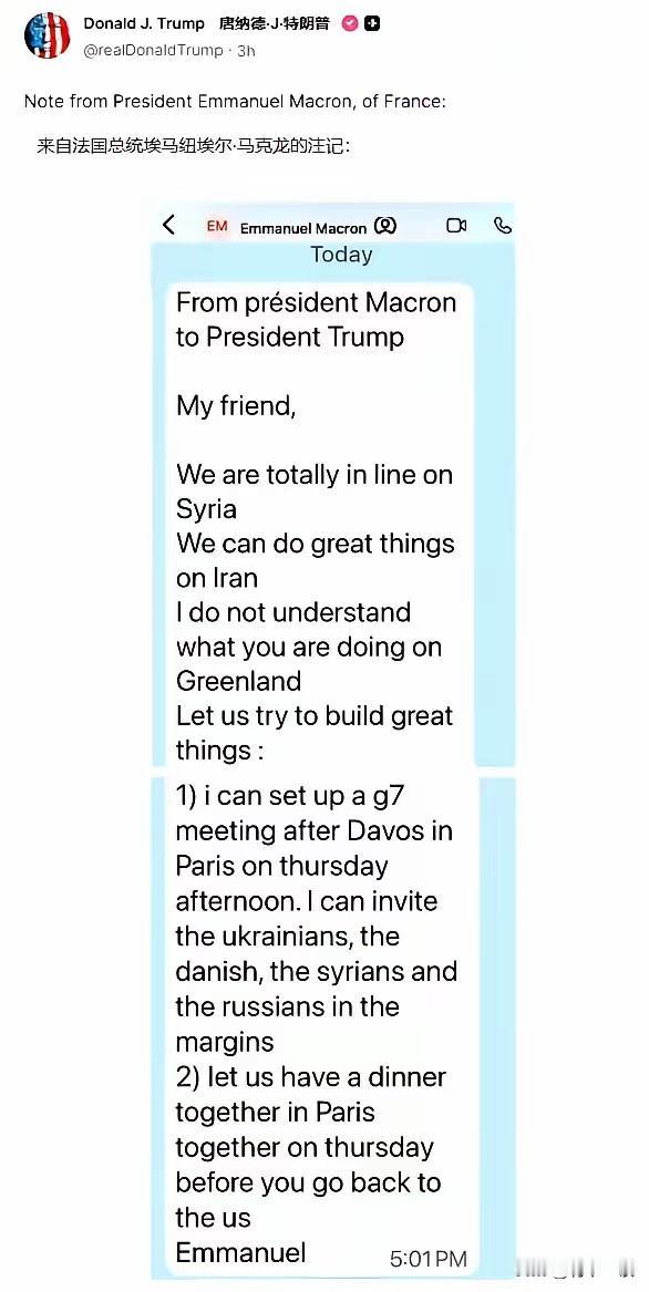 我把你放心上,你把我放网上! 马克龙这回算是彻底社死,特朗普直接把马克龙发给他的私信给公开到网上了,扒掉了马克龙伪君子的面具。 信里马克龙完全没了公开场合的硬气,反而是一副“求和”姿态,又是提议在达沃斯张罗G7会议,美法在叙利亚、伊朗能成大事,又要邀请叙利亚、乌克兰、俄罗斯代表跟特朗普见面,甚至还要在巴黎共进晚餐。 这前后的反差,简直就是一个在天上,一个在泥里。特朗普最恨这种“两面三刀”的政客,直接公开,不留一点情面。 马克龙本想展现独立姿态,结果在私底下又想通过妥协来换取利益。这种“台上硬刚,台下求饶”的操作,暴露了欧洲在面对美国霸权时的尴尬与无力。 特朗普的这一记“耳光”,打醒了不少还在幻想欧美“铁盟”的人。马克龙的“两副面孔”,正是当前国际秩序下,小弟想在大哥阴影里搞平衡的窘态写照。一边是美国“美国优先”的大棒,一边是欧洲自身利益的算盘,这种撕裂只会越来越深。当“伪君子”的面具被撕下,我们看到的,是一个更加真实、也更加动荡的西方世界。 法国马克龙