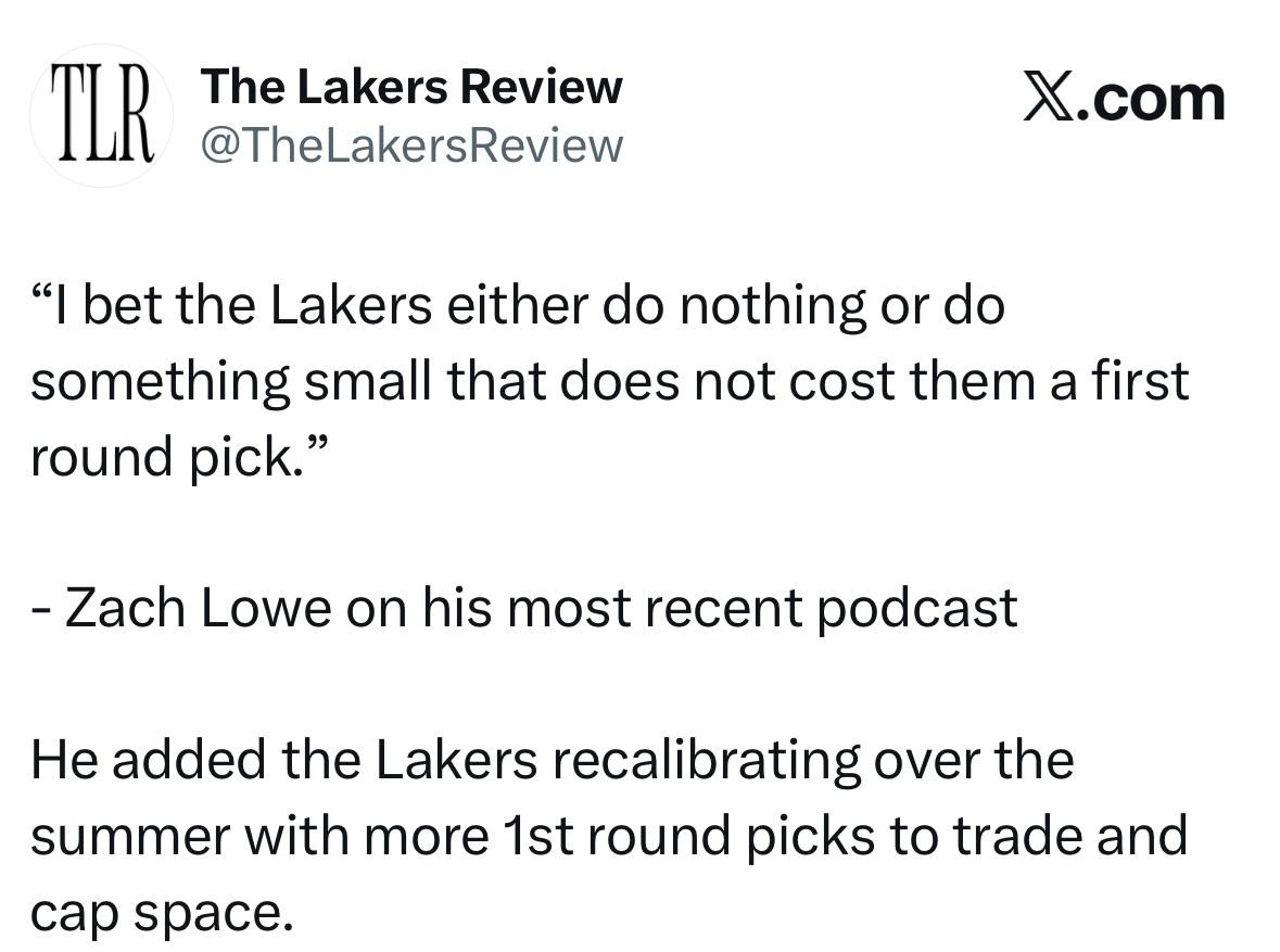 Zach Lowe:“我敢打赌,湖人要么在交易截止日前毫无动作,要么只做一些不涉及首轮签的小交易。” 湖人会在今年夏天重新调整阵容,届时他们将拥有更多可交易的首轮签和薪资空间。