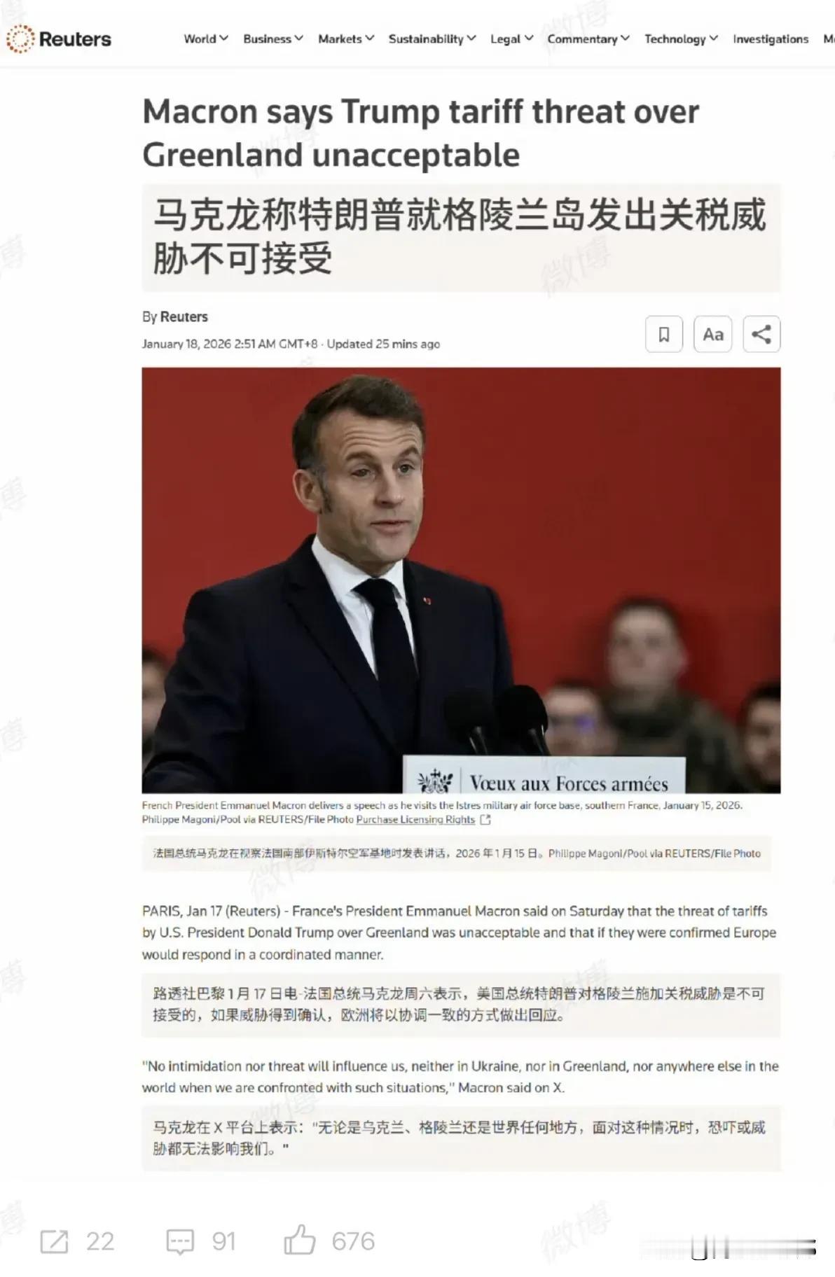 马克龙总是公开地宣称要捍卫欧洲和法国利益,川普的压力似乎对马克龙无效。不过,私底下却是另一副面孔,他说和川普在叙利亚,伊朗都有共同利益,不理解川普为什么还要格陵兰。他还建议由他组个饭局,约叙利亚,乌克兰和俄罗斯和川普见面聊聊。 川普一点面子也被不给,直接曝光马克龙两面三刀的做法,看来马克龙不仅仅在家里被打脸,在职场被盟友打脸有会司空见惯!