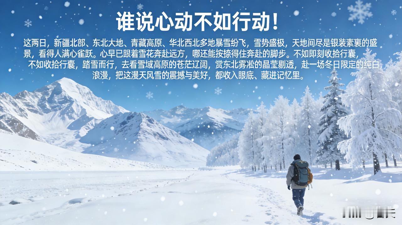 赴一场冬日雪境之约 谁说心动不如行动!这两日,新疆北部、东北大地、青藏高原、华北西北多地暴雪纷飞,雪势盛极,天地间尽是银装素裹的盛景,看得人满心雀跃。心早已跟着雪花奔赴远方,哪还能按捺得住奔赴的脚步。不如即刻收拾行囊,踏雪而行,去看雪域高原的苍茫辽阔,赏东北雾凇的晶莹剔透,赴一场冬日限定的纯白浪漫,把这漫天风雪的震撼与美好,都收入眼底、藏进记忆里。