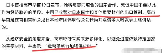 不会因为中国的压力而让步,高市早苗出来表态了!1月19日,日本首相高市早苗宣布,她将与志同道合的国家合作,敦促中国不要以此作为“经济胁迫”的手段。高市早苗称,中国已收紧对日本稀土和其他重要材料的出口管制。日本将会让采购来源多样化,以避免过度依赖特定国家的重要材料,我希望努力加强供应链。 这招其实也不新鲜,就是典型的死鸭子嘴硬,高市早苗一口咬定咱们是在“胁迫”,说明她根本不想去想为啥会被卡脖子,只想着怎么跟咱们硬刚到底。 咱们要知道,稀土这玩意儿可不是普通的土,它是现代工业的维生素,无论是造高精尖的芯片、导弹制导系统,还是咱们开的电动车、用的手机,哪一样离得开这些稀有的材料。 日本作为一个资源极度匮乏的岛国,长期以来对咱们中国的稀土依赖度那是相当高,以前咱们为了维护经贸关系,基本上是有求必应,甚至低价供应,结果换来的却是他们在关键时候的背刺。 现在咱们既然收紧了出口管制,那就是到了不得不出手的时候,这不仅仅是针对高市早苗个人的态度,更是针对日本近年来在半导体设备、对台海问题指手画脚等一系列行径的反制。 高市早苗现在喊出要搞供应链多元化,听着挺美好,可真要操作起来,那难度简直比登天还大。 稀土这东西,不是说你地里挖出来就能用,从开采、分离到提炼,每一个环节都是高污染、高技术的活,全世界能把这一整条产业链都做得便宜又高效的,除了咱们中国,还真找不出第二个。 美国那边倒是也有稀土矿,但这么多年了也没能完全恢复起来,就是因为环保成本太高,技术断层太严重,高市早苗想拉拢盟友去填补这个空缺,没个三五年的功夫根本见不到成效。 这就好比一个人习惯了吃现成的快餐,突然要让他自己去种菜、磨面,还要保证价格低廉,那最后的结果要么是自己饿肚子,要么就是花天价去买替代品。 对于日本的企业来说,这简直就是灾难,像丰田、索尼这些巨头,它们的制造生产线都是围绕着咱们稳定供应的材料来设计的,一旦供应链断了或者换了来源,成本立马就得飙升,最终还得转嫁给消费者。 高市早苗嘴上说着要“加强供应链”,实际上是把日本的企业往火坑里推,毕竟商人是逐利的,哪里便宜稳就用哪里,政客的一时意气,最后买单的还是本国老百姓。 再说回她口中的“经济胁迫”,这纯粹是贼喊捉贼,当年日本在半导体领域联手美国制裁咱们的时候,怎么不说是“经济胁迫”? 现在咱们只是在自己的主权范围内调整出口政策,符合世贸组织的规则,怎么就成了他们口中的罪过? 国际社会讲究的是礼尚往来,你敬我一尺,我敬你一丈,你要是老想在咱们的底线上蹦跶,那就别怪咱们把桌子掀了。 高市早苗这种激进的做法,其实是在拿日本的经济命脉去赌她的政治筹码,赌的就是咱们会因为经济受损而先松手,但她这次可能算错了盘。 咱们现在的经济体量早就不是当年那个只能靠低端出口赚外汇的时候了,内循环的动力强劲,稀土作为战略资源,优先保障咱们的国家安全和高端制造发展,这完全是合情合理的。 就算日本真的搞成了多元化,那也是几年后的事了,这几年空窗期谁难受,谁心里清楚。 而且,市场是连在一起的,就算他们找到了新的供应商,只要咱们在下游技术和终端市场上保持优势,上游的原料供应也难以彻底摆脱咱们的影响力。 这就好比咱们掌握了做菜的核心秘方,你换个地方买菜,但这菜的味道好不好吃,最后还得看厨子的手艺,而现在的“厨子”很大程度上还在咱们这儿。 高市早苗现在的高调表态,更多是做给国内右翼和美国主子看的,展示一种“我不服输”的姿态,试图掩盖内心的慌张。 咱们老百姓看着乐呵就行,没必要太当真,真到了疼的时候,日本那些财团自然会去找政府的麻烦,到时候看她还能不能硬得起来。 既然她选择了这条路,那咱们就奉陪到底,看看是他们的嘴硬,还是咱手里的材料硬。 这场博弈才刚刚开始,随着时间的推移,日本制造业的成本压力会越来越大,等到他们的产品因为成本高昂而在国际市场上失去竞争力的时候,就是他们不得不坐下来重新谈判的时候。 高市早苗想用政治手段去对抗经济规律,这注定是一场打不赢的仗,咱们只需按部就班地推进咱们的战略,剩下的就交给时间去验证。 不管是稀土还是其他关键材料,既然是手中的牌,咱们就有权决定怎么打,对手急了,说明咱们打到了七寸上。 接下来的日子,咱们就静静地看着日本怎么折腾他们的“供应链多样化”,这出戏,才刚刚拉开帷幕呢。 信源:路透社 (Reuters) - 2025年1月19日