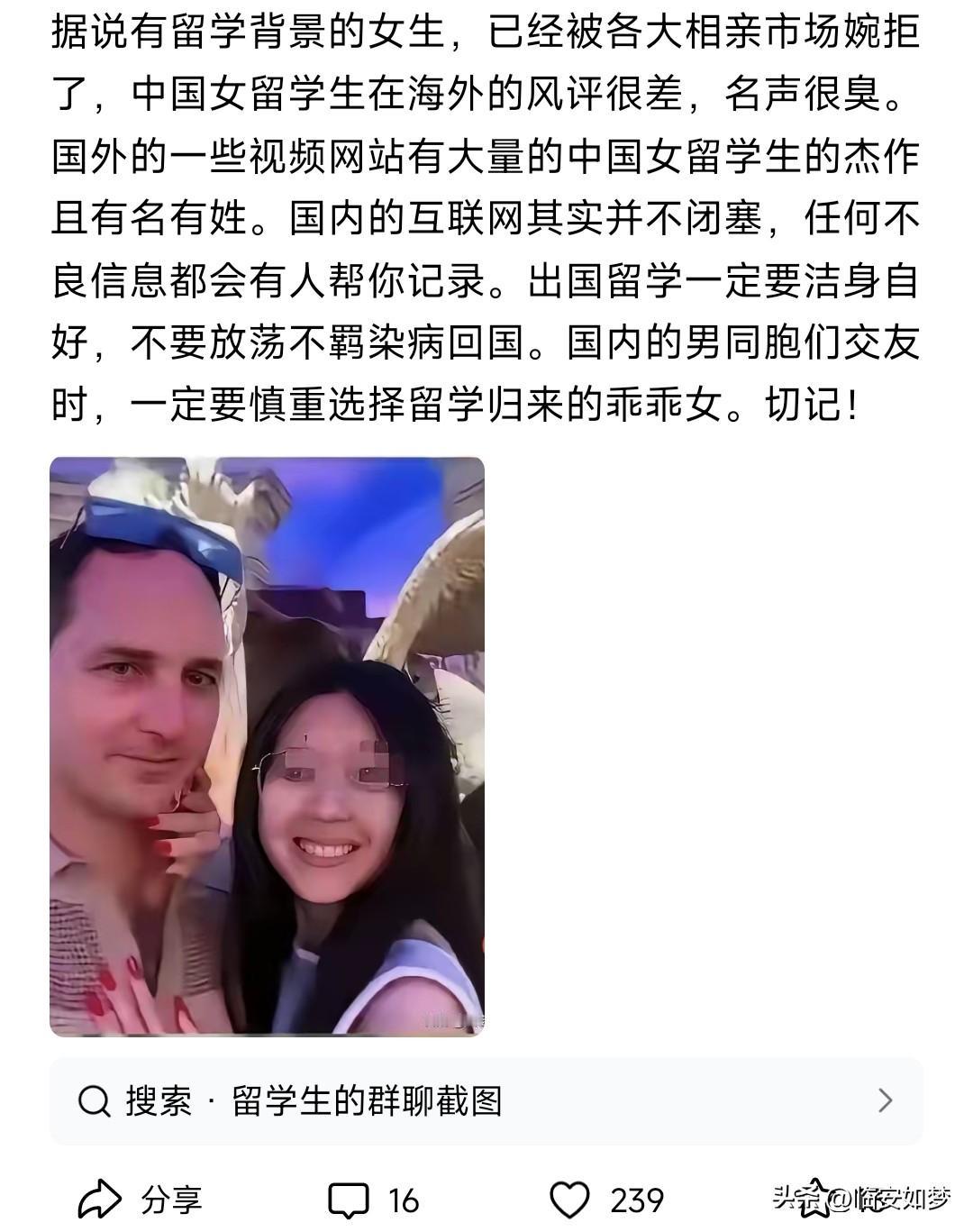 我一个研究生师妹出国读博士,还是美国斯坦福大学博士。在国内的时候人挺好的,文文静静,去了美国几年,唉简直是回炉重造。微信里自拍照头发染黄,皮肤古黄色,眼睛搞成眯眯眼,穿的衣服十分暴露,如果不看微信朋友圈我根本不相信那人是她。最重要的是经常发一些和各种明显年纪比她大很多的老白男,老黑的合照接吻照还有抽雪茄的照片,活脱脱一个小太妹。。。 他们家就她一个女儿,父亲是大学教授母亲是高中老师。。。