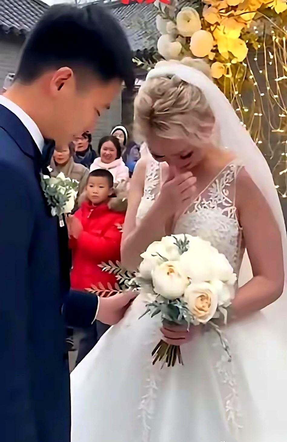 一个外国姑娘,在自己的婚礼上,哭得稀里哗啦。 旁边她老公,一个中国小伙,有点手足