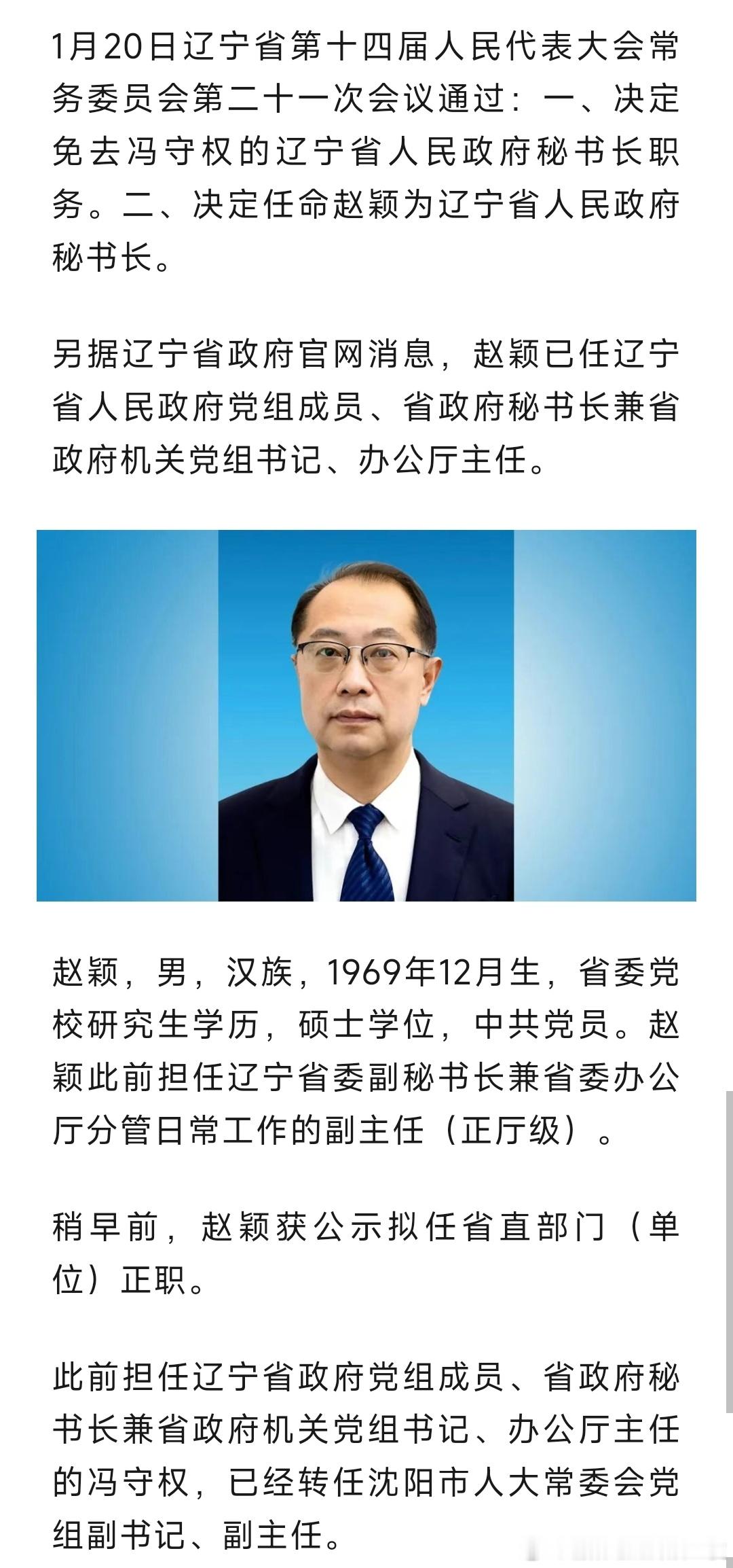 赵颖已任辽宁省政府党组成员、省政府秘书长。