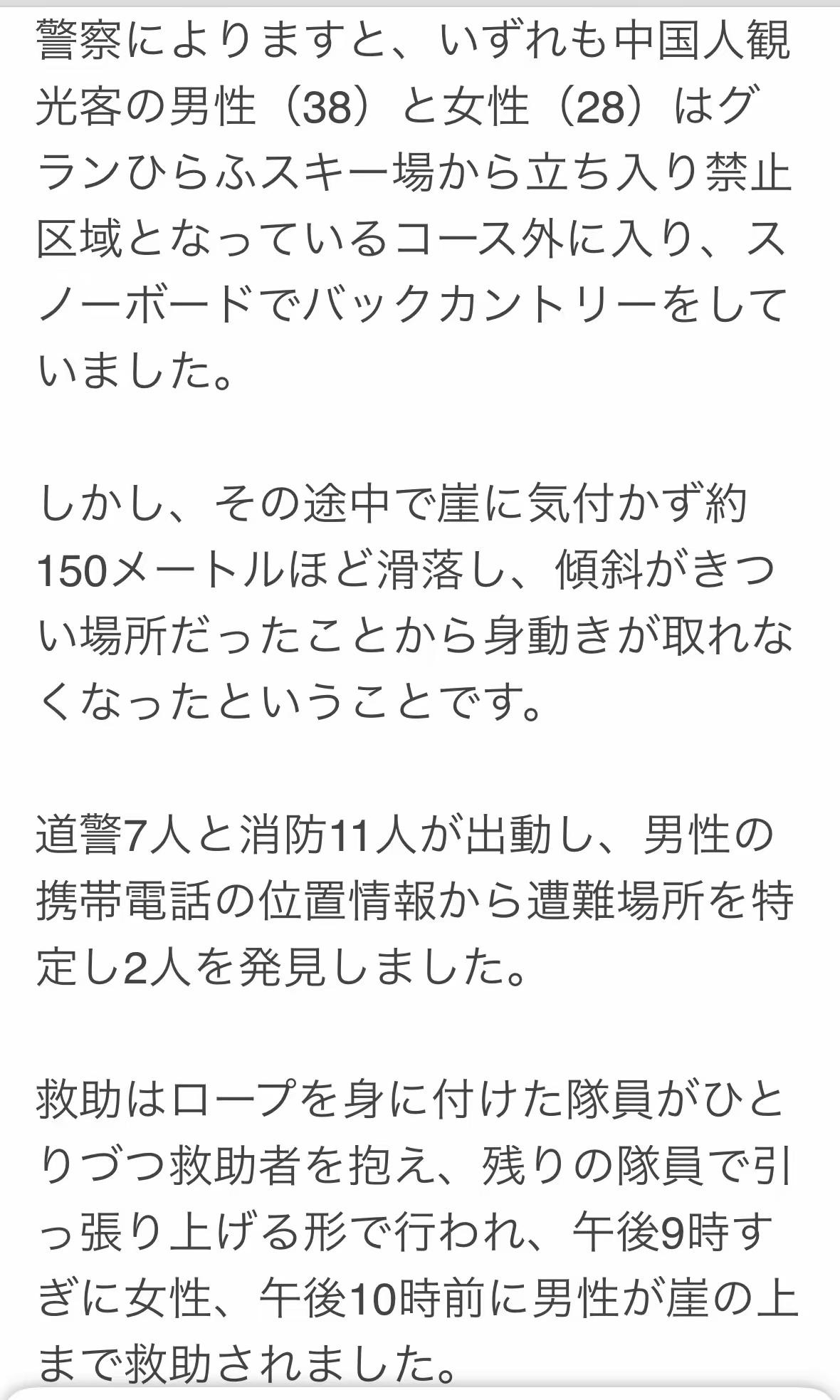 这会是谁呢? 据倭媒报道,1月17日下午,两名中国游客一男(38岁)一女(28岁)在倭国北海道俱知安町滑雪,私自滑入新雪谷场外的禁区,从150米高处坠落,被困在坡度陡峭处。随后该男子男子用中文报警,北海道出动了7名警员和11名消防员,根据男子手机定位确定了救援地点。救援人员身系绳索将他俩依次拖上来,直到当晚10点之前获救。 很好奇的是这两个人是谁?居然还引起倭国媒体的关注?而且报道还特别强调男38岁,女28岁? 灵光一闪,忽然想起,前不久有媒体报道国内某大公司老板的公子,就带着几位年轻友人去倭国北海道滑雪。巧合的是这位公子刚好也是38岁。 真的这么巧合?