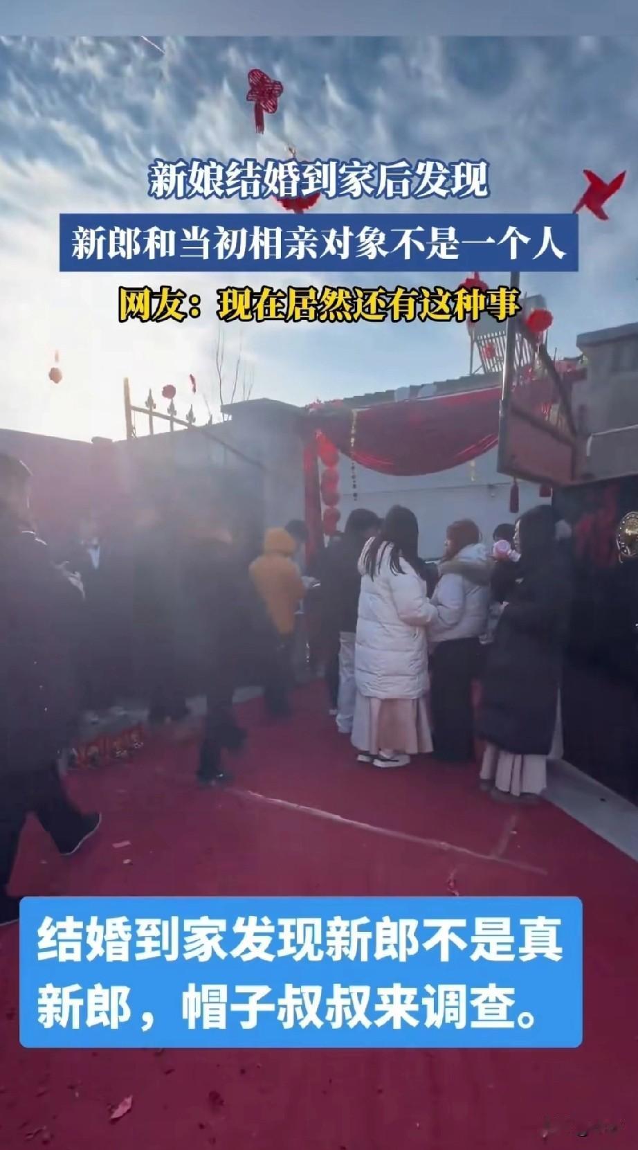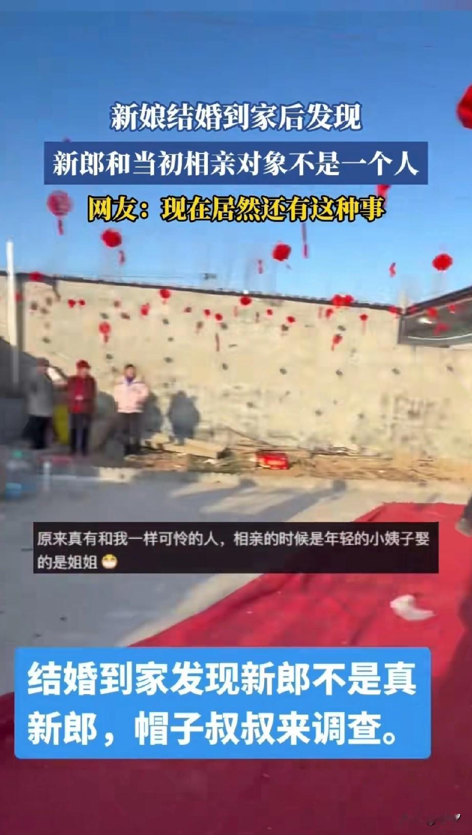简直太离谱了,某地结婚现场惊现大瓜,相亲的时候新郎帅气逼人,结婚的时候发现货不对版! 这年头结婚现场发现新郎不对版,和自己相亲的时候,不是一个人,这让新娘当场暴跳如雷! 新娘的亲戚们更是怒不可遏,当场报警,叔叔也是很快到了现场,目前正在调查此事! 据知情人表示,当时婚礼现场,新娘突然发飙,表示自己被骗了,自己的老公不是这个人! 新娘的亲戚一脸错愕,新郎的亲戚及新郎劝女生赶紧结了,不要惹是生非,彩礼都给了,你不结婚就是欺骗! 听到现场的吵闹声,村里人秒变吃瓜群众,大家纷纷吃着瓜子在戏,但是新娘丝毫不怂,毕竟有亲戚朋友在场! 这事一传出来让人不敢相信,这年头听说女的有骗婚,没想到还有男的骗婚,也不知道男方家是怎么想的, 相亲的时候是一个,结婚的时候又是另一个人,都不想想女生怎么可能同意!可能是觉得彩礼给够了,只要新娘父母同意, 双方压力之下,新娘不敢不从,殊不知现在这社会已经变了,婚姻自由,父母的话不再是一言堂了! 网友留言想不到还有和我一样命苦的人,相亲的时候是年轻的小姨子,取得却是姐姐! 大家对于结婚现场新郎货不对版,这事怎么了?