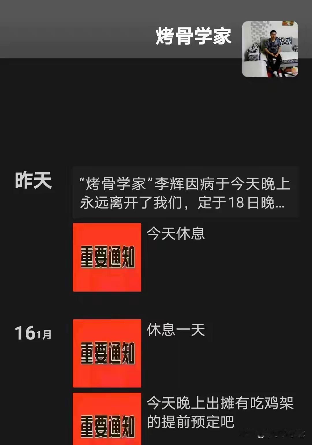 辽宁抚顺市著名的“烤骨大王"李辉1月18日因病去世,池经营的烧烤店在抚顺市很有名气,特别是他的烤鸡架味道鲜美,好多人还有外地人不怕距离远都去品尝,被大家冠以烤骨大王的美誉,可惜的是他前几天摔了一跤,导致脑出血而去世,家里人看他天天起早贪黑的很辛苦让他别干了,他说身体健康没有什么问题再干几年,没想到几天后就出事了,命也。