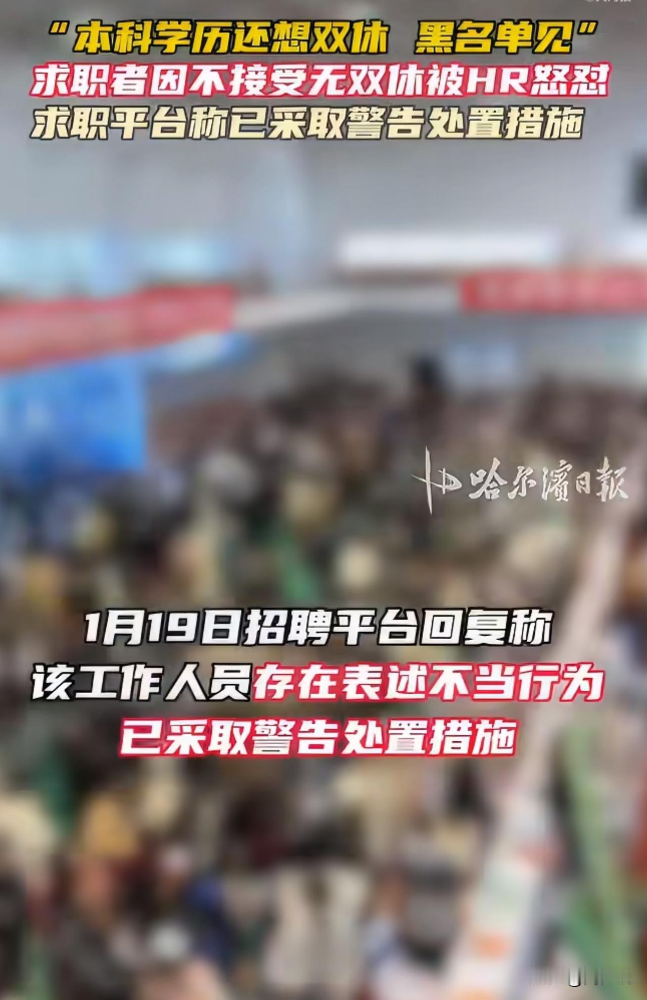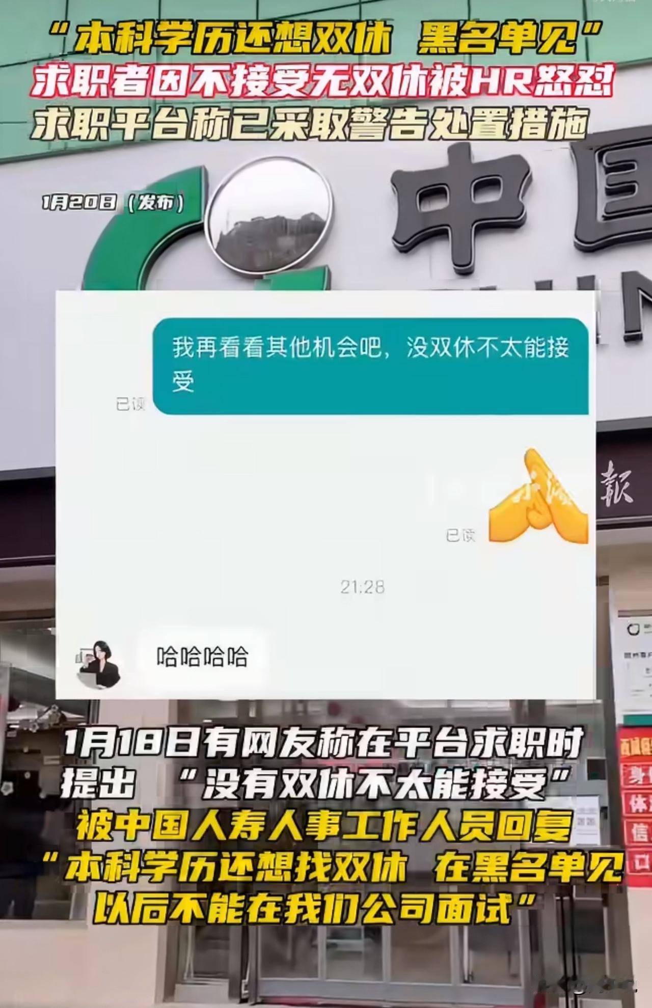 “太气人了!”近日,有网友应聘中国人寿岗位时,只因提出“无法接受单休”,就被公司HR怒怼,直言“本科学历还想找双休”,甚至扬言将其拉入面试黑名单,这番离谱操作让网友直呼刷新三观。 此事一出引发网友热议,有网友怒批“手里有点小权力就飘了,忘了自己也是打工人”。 也有网友吐槽“这是把职场权益和学历挂钩,太离谱”。 针对此情况,涉事招聘平台回应,确认该HR表述不当,已对其作出警告处理。 在周少看来,这事确实让人很气愤,求职应聘是双向的选择,也有权力发表自己的意见看法。更何况,求职找双休也是个人选择。 反观HR是企业的门面,其言行不仅体现个人职业素养,更代表企业形象,用学历贬低求职者、否定劳动者的法定休息权,既违背《劳动法》,也暴露了职业素养的缺失。 当然,这事也给所有企业敲响警钟,必须加强员工职业素养与法律意识培训,尊重劳动者的合法权益是基本准则。职场本是双向选择,唯有互相尊重,才能构建健康的招聘生态。#寻美三湘# #长沙新朋友#