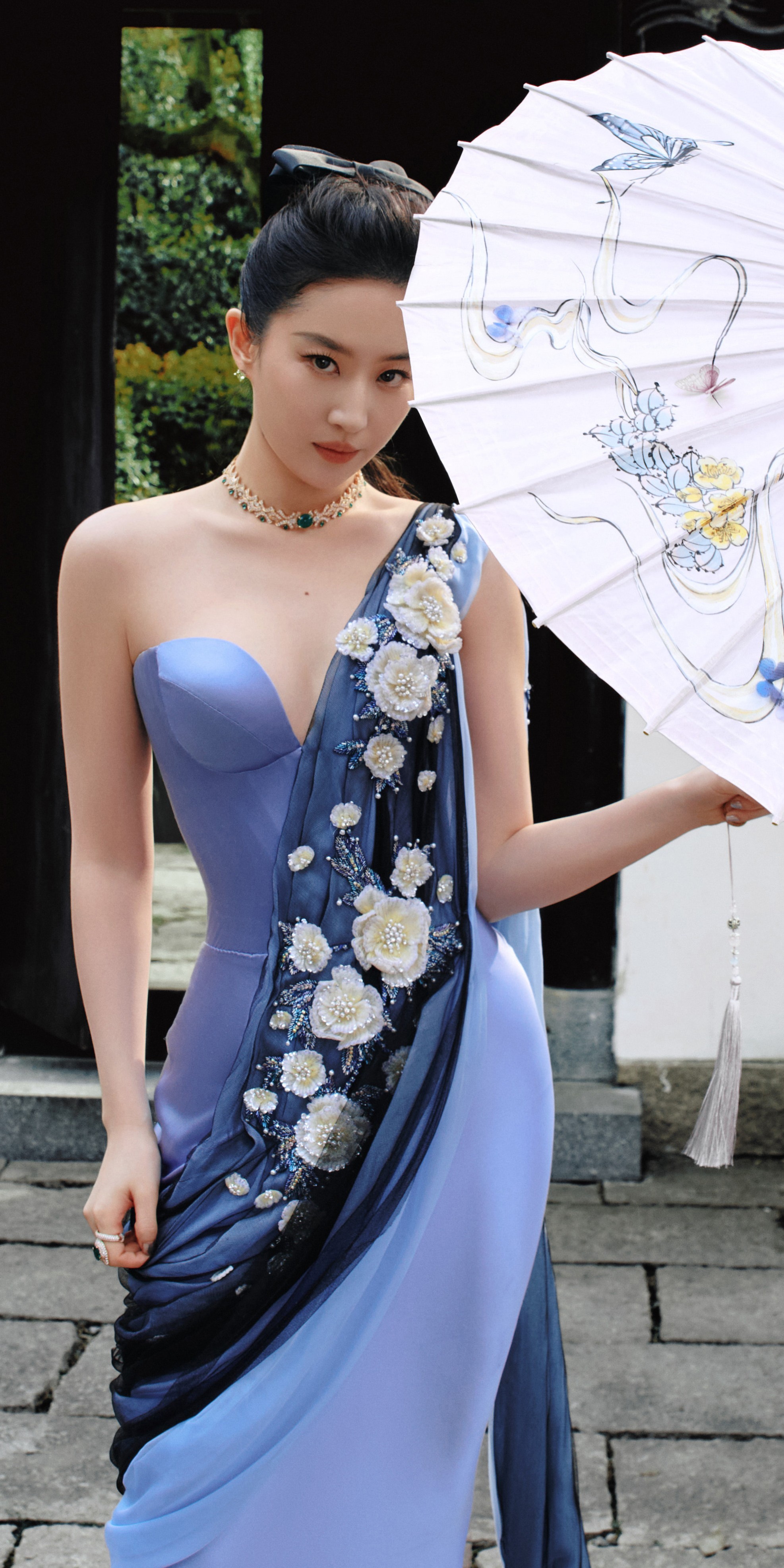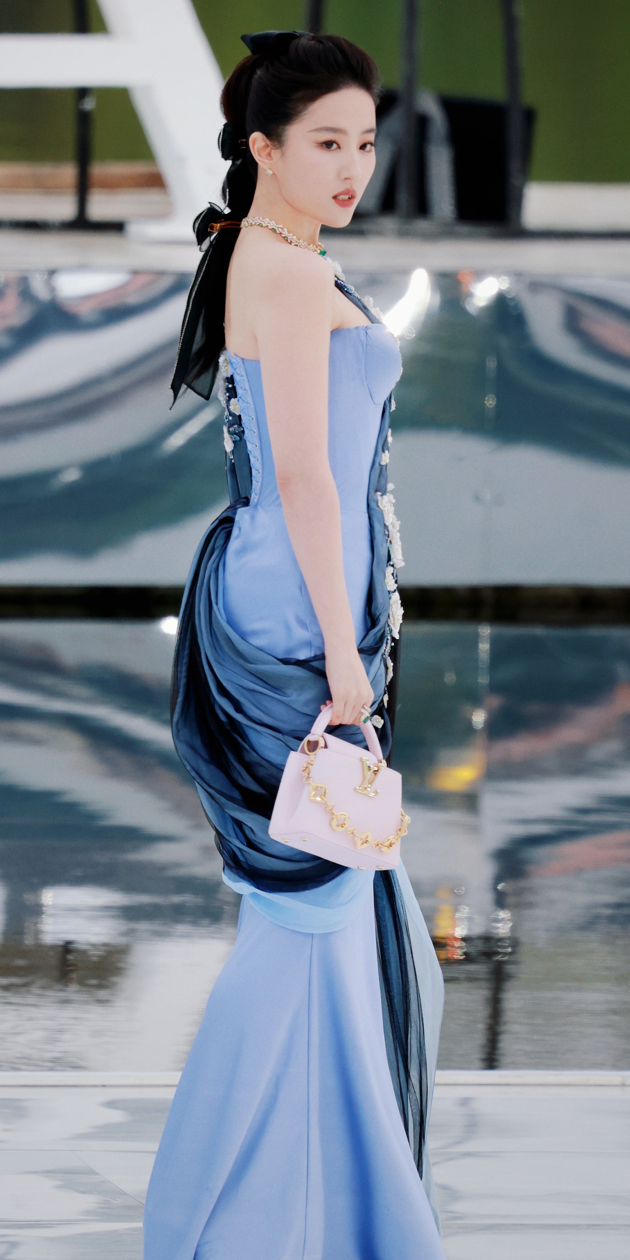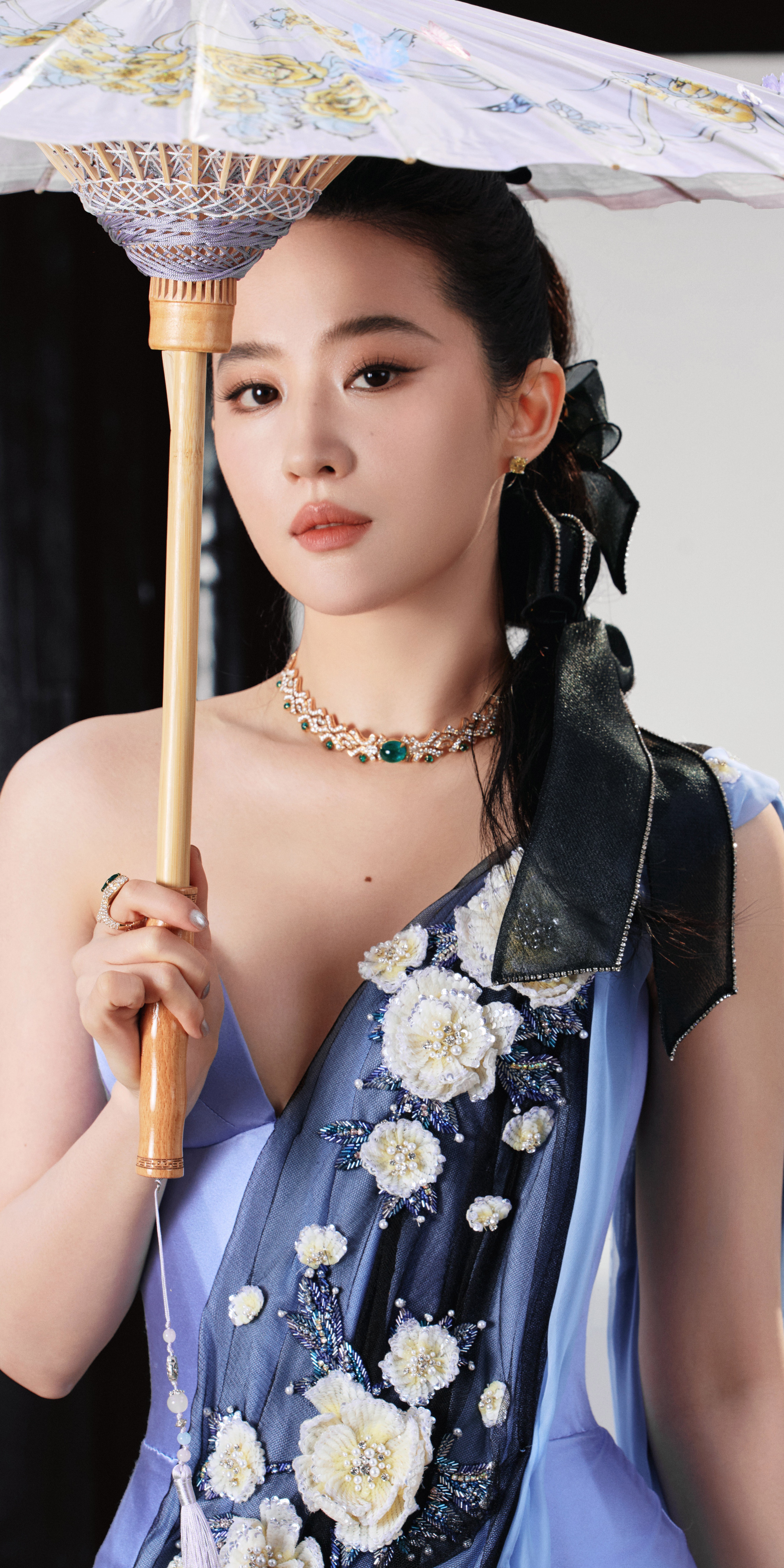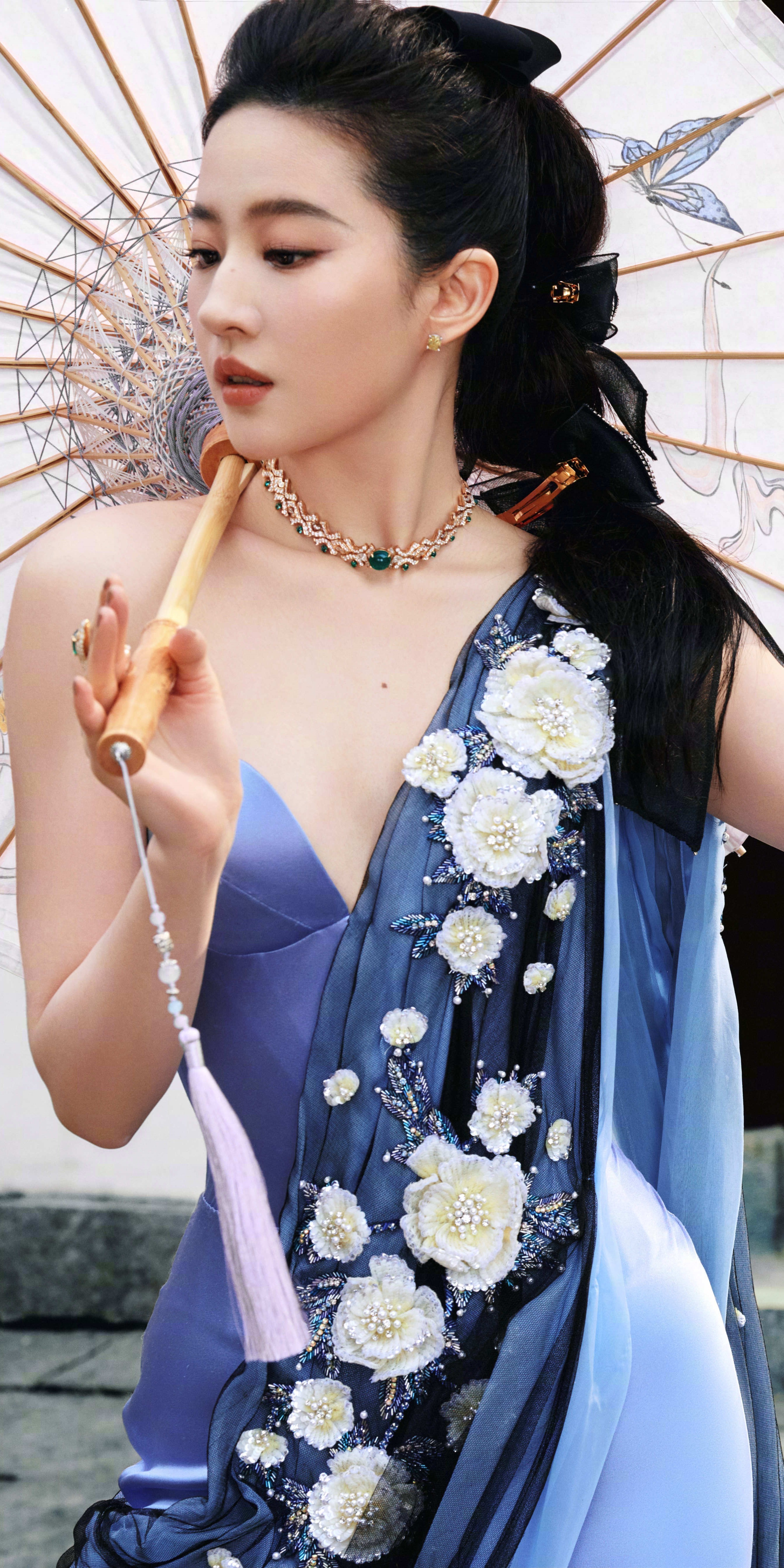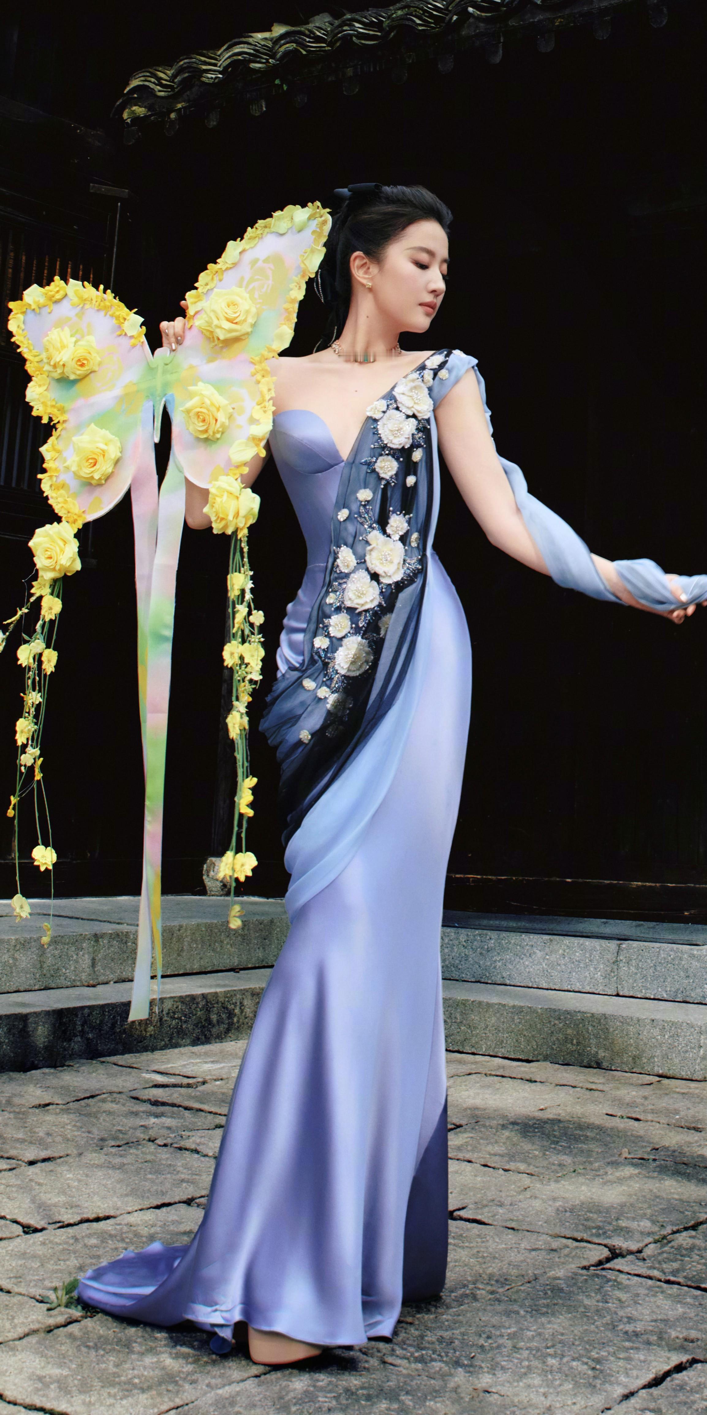 刘亦菲亮相西湖,蓝绸裹身,贵气优雅。刘亦菲