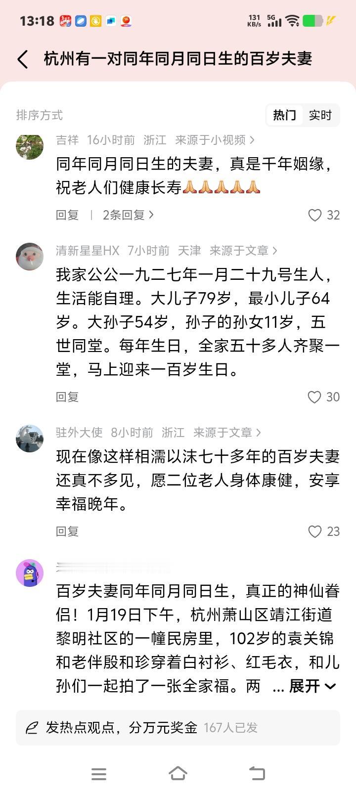 杭州萧山惊现“世纪同生”百岁神仙眷侣!102岁夫妻同年同月同日生,相守75年秘诀竟是“不管闲事”?四世同堂现场甜到齁! (来源:潮新闻、杭州日报等综合报道) 当大多数人还在为“七年之痒”烦恼时,杭州萧山靖江街道黎明社区的一对老人,已经将婚姻谱写成了一部跨越世纪的传奇。袁关锦和殷和珍,两位出生于1924年3月26日的老人,今年双双102岁。他们不仅共享同一个生日,更携手走过了75年的婚姻长河。近日,这对“世纪夫妻”补拍婚纱照的温馨场面,让无数网友直呼:“我又相信爱情了!” 走进这个四世同堂的家,喜庆的红布与“囍”字映照着满堂的笑脸。102岁的殷奶奶穿着红衣,仅剩的一颗牙齿也藏不住她咧嘴的幸福笑容。一旁同样精神矍铄的袁爷爷,眼里满是温柔。化妆师为他们轻轻装扮,邻居们挤在窗边道喜,这哪里是寻常拍照,分明是一场关于爱与时间的盛大庆典。 他们的日常,平淡中透着惊人的反差与默契。袁爷爷是“养生派”,早睡晚起,饮食清淡,炒青菜都要放糖,曾是区跑步冠军的他如今最爱去菜市场溜达,和老友打打牌。殷奶奶则是“活力派”,清晨六点起床扫地,无肉不欢,年轻时能喝七八两黄酒,至今仍爱小酌。口味迥异?没关系。女儿袁雅琴会准备两份餐食,一份偏甜,一份正常。爱,就藏在这份“区别对待”的细心照料里。 人们总爱追问长寿与婚姻幸福的秘诀。子女们笑着总结:心态好,不管闲事。这简单的六个字,背后是数十年如一日的包容与智慧。一个主外,负责赚钱拿主意;一个主内,操持家务。他们会拌嘴,却从未真正红过脸。他们的世界不大,只装得下彼此和这个家,外界的纷扰仿佛自动屏蔽。这种“钝感力”,或许正是抵御岁月风霜的铠甲。 更动人的,是时光流转中角色的互换。当年,父亲袁关锦极力督促调皮的小女儿多读书;如今,59岁的女儿像照顾孩子一样,给102岁的父亲剥糖,为吃鱼的母亲细心剔刺。74岁的大儿子和67岁的小儿子轮流陪夜,聊家常,话里话外都是珍惜。父母在,人生尚有来处;父母健康,便是儿孙最大的福气。这份“老小孩”与“小家长”的温情,让生命的轮回充满了暖意。 社区的温度也浸润着这个家庭。免费的老年食堂餐食每天准时送达,党员志愿者定期上门,适老化改造让生活更安全。袁爷爷常念叨:“国家真好,照顾我们。”从自食其力到安享晚年,他们的长寿故事,也是时代发展与基层善治的生动注脚。 一张迟到了75年的婚纱照,定格的不只是笑容,更是一个关于陪伴、包容与时代温情的中国式家庭范本。在这个追求速成的时代,他们用一生的慢行告诉我们:最长情的浪漫,是陪你一起慢慢变老;最顶级的智慧,是经营好自己的小日子。所谓神仙眷侣,不过是把平凡的日子,过成了不老的传说。 百年爱情 长寿秘诀