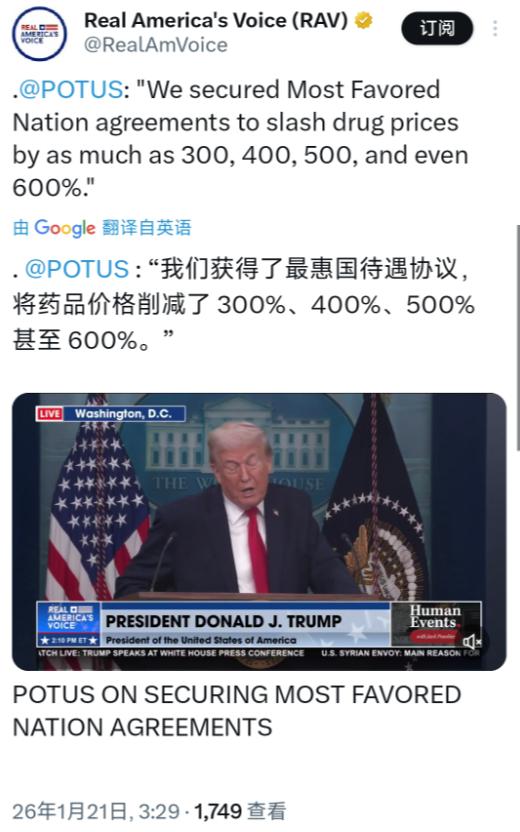 特朗普今天(北京时间1月21日)召开新闻发布会,高调宣称一项核心成就。他明确表示,他们获得了最惠国待遇协议,还把药品价格削减了300%、400%、500%甚至600%。 特朗普的这番宣称,压根经不起推敲。从最基础的数学逻辑来看,这种降幅本身就不成立。药品价格削减100%意味着药品完全免费,商家一分钱都收不到。削减幅度超过100%,本质上就等同于制药公司要倒贴钱给买药的人,这在正常的市场交易中根本不可能发生。 熟悉美国药价体系的人都清楚,特朗普大概率是混淆了价格对比的口径。他口中的“降幅”,很可能是把美国本土药品的原价,和其他国家的最低售价做了生硬对比,再强行换算成所谓的“削减比例”。这种计算方式本身就不科学,更不符合市场实际。 特朗普口中的“最惠国待遇协议”,其实不是新东西。早在2020年,他就曾签署过类似的行政令,试图通过将美国药品价格与其他国家的低价挂钩来降费,最终却被联邦法院否决。再次当选总统后,他在2025年4月、5月多次推进相关政策,核心都是想让美国药价向全球最低价看齐。 美国药价居高不下是长期难题。数据显示,美国品牌处方药的价格平均是其他发达国家的2.56倍,部分抗癌药、罕见病药的价格甚至是中国的10倍、26倍。这种高价背后,是药企、流通商、医药福利管理组织等多方利益深度绑定的结果,美国政府长期缺乏有效的调控工具。 特朗普政府确实和部分药企达成过降价协议。2025年11月,他宣布与礼来、诺和诺德达成共识,将部分减重药物的联邦医疗保险支付价下调,符合条件的患者每月自付费用可降至50美元。即便如此,这类药物的实际降幅也远没到300%,只是从每月上千美元的高价降到了相对可及的水平。 不少药企对特朗普的政策其实是被动妥协。辉瑞等企业在达成最惠国价格协议后,已经开始向欧洲等海外市场施压,试图通过提高海外药价来弥补美国市场的收入损失。这种转嫁成本的操作,本质上并没有真正降低全球药价,只是改变了价格分布。 特朗普的夸张表述,更多是出于政治宣传的需要。美国医疗支出常年高企,2022年医疗总费用占GDP比例高达17.3%,药价问题直接关系到大量选民的利益。临近选举周期,用极端化的数字宣称成就,更容易吸引选民关注,尤其是老年群体的支持。 业内对特朗普的药价政策普遍持谨慎态度。他的诸多承诺往往缺乏清晰的实施路径,此前喊出的30%到80%降幅目标,至今没有完整的落地细则。美国政府本身没有直接与药企议价的权力,即便推出行政令,也会面临司法挑战和行业抵制。 简单来说,特朗普宣称的600%药价降幅,是不符合数学逻辑和市场实际的夸张表述。他推动的最惠国待遇协议确实在一定程度上压低了部分药品价格,但实际效果远没有口号那么惊人。美国药价问题的根源的是复杂的利益链条,想要彻底解决,绝非靠几句夸张口号就能实现。