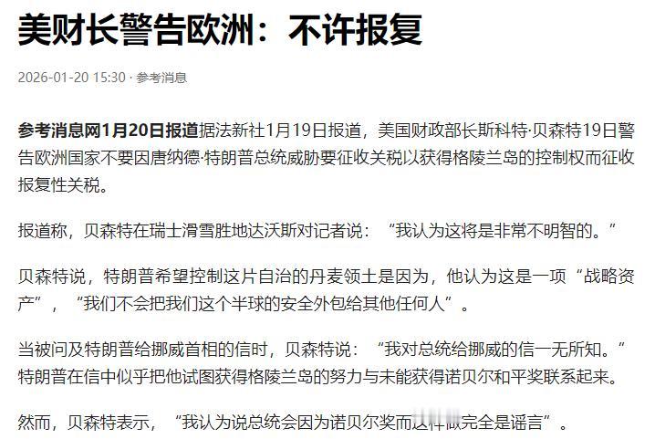 好家伙,直接明抢了! 美国财长突然宣布说: 1月20日,美国财长贝森特再次发声:要求欧洲切勿报复美国在格陵兰的行动,并呼吁欧洲人对格陵兰归属美国持开放态度。这标志着特朗普政府“100%”兑现了对丹麦、挪威等八国加征关税的威胁,甚至不排除使用武力“夺岛”。 这话一放出来,直接把“明抢”俩字焊死在脸上了。 1月20日,美国财长贝森特再次站出来发声。他明确要求欧洲各国切勿报复美国在格陵兰的相关行动。他还公开呼吁欧洲人对格陵兰归属美国这事儿,拿出开放态度。 贝森特的表态不是空穴来风。就在这个周末,特朗普已经高调放话。从2月1日起,美国将对丹麦、挪威、瑞典、法国、德国、英国、荷兰、芬兰这八个反对其收购格陵兰岛的欧洲国家,加征10%的关税。到了6月1日,这一税率还会直接飙升至25%。特朗普把话说得死绝,关税会一直加下去,直到各方就“完全、彻底购买格陵兰岛”达成协议。 欧洲这边刚被关税威胁炸锅,贝森特就立马出来“补刀”。他在达沃斯论坛上接受采访时,全程带着嘲讽的语气。他直言欧盟决策程序向来迟缓,根本没能力快速制定强力反击措施。他还拿欧洲持续采购俄罗斯能源举例,暗讽欧洲连能源问题都拍板不果断,更别提应对美国的关税施压了。 欧盟本来计划动用被称为“贸易火箭筒”的反胁迫工具,还筹备对价值930亿欧元的美国出口商品加征报复性关税。贝森特压根没把这些反制放在眼里。他直接警告欧盟,敢对美国采取反制措施,就是“极不明智”的选择。 有猜测说欧洲可能会抛售美国国债反击。贝森特更是直言这种做法“无异于作茧自缚”。他还顺带踩了一把法国,称美国去年实现了财政紧缩,反观法国,财政预算制定一直陷入困境。 特朗普政府对格陵兰岛的野心,早就藏不住了。格陵兰岛是世界第一大岛,属于丹麦的自治领地,外交和国防事务归丹麦政府统筹。美国对这片土地的觊觎,能追溯到上世纪40年代。杜鲁门政府当年就曾提出用1亿美元黄金加阿拉斯加部分油田开采权换格陵兰岛,被丹麦果断拒绝。 1951年,美国通过和丹麦签署国防协议,拿到了在格陵兰岛建造、维护军事基地的权利。现在美国在当地还有皮图菲克太空基地,这个基地曾是冷战时期美国对苏核攻防战略的重要支点。 特朗普政府更是把格陵兰岛当成了必争的“战略资产”。贝森特反复强调,美国不会把本半球的安全保障责任外包给任何国家。格陵兰岛地处北极要地,扼守欧亚大陆与北美最短的海空航线,对美国的弹道导弹预警系统至关重要。 格陵兰岛地下还藏着丰富的稀土、石油和天然气资源。这些资源对军工生产、半导体制造都是刚需。随着全球气候变暖,北极冰层融化,当地资源开采难度降低,北极航道的商业潜力也逐渐凸显。这些利益,特朗普政府显然不想错过。 为了拿到格陵兰岛,特朗普政府已经无所不用其极。特朗普不仅任命了专门的格陵兰岛特使,还多次放话“美国必须得到格陵兰岛”。白宫新闻秘书早就证实,特朗普团队正在讨论包括“动用美国军队”在内的一系列选项,来实现这一目标。 1月20日当天,特朗普在社交媒体上更是直接表态,格陵兰岛对国家安全和世界安全至关重要。他宣称这件事“已无回头路可走”,还直言要从北约盟友丹麦手中夺取格陵兰岛的主权。 面对美国的强硬施压,欧洲各国纷纷表态反对。丹麦副首相兼国防大臣波尔森明确说,特朗普的威胁完全不可接受。英国首相斯塔默直接指责美国的做法“完全错误”。德国政府也在和欧洲伙伴密切磋商,准备采取应对措施。 欧盟委员会主席冯德莱恩更是公开站队,强调领土完整和主权是国际法的基本原则,欧盟坚定地与丹麦以及格陵兰岛民众站在一起。格陵兰岛自治政府总理尼尔森也多次重申,格陵兰岛的领土完整和法律地位根植于国际法,不容任何人忽视。 丹麦首相弗雷泽里克森的表态更直接。她警告特朗普,如果美国敢军事攻击丹麦这个北约国家,存在70多年的北约军事同盟恐将终结。她还明确表示,丹麦的领土不会“挂牌出售”。 美国的行径,本质上就是霸权主义和强权政治的赤裸裸体现。作为二战后国际秩序的主要构建者,美国现在却公然践踏国际关系基本准则,无视《联合国宪章》宗旨与原则,用关税威胁、武力恐吓的方式,掠夺盟友的利益。 这种“掠夺外交”不仅撕裂了跨大西洋关系,还让美国的国际形象一落千丈。丹麦国防情报局已经首次将美国列为潜在的安全威胁。欧盟智库也直言,美国的做法正在加剧欧盟内部对跨大西洋关系走向的集体不安。 现在的局势很明确,美国为了抢格陵兰岛,已经做好了和欧洲盟友撕破脸的准备。欧洲各国的反击虽然态度坚决,但受制于内部决策效率等问题,能否形成有效合力还不好说。这场明晃晃的“夺岛”大戏,后续还会持续发酵。