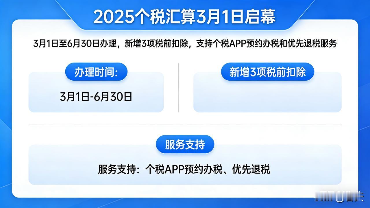 2025个税汇算3月1日启幕 3月1日至6月30日,2025年度个税汇算正式办理。今年新增3项税前扣除政策,进一步扩大优惠覆盖范围,为纳税人减负。 办税渠道持续优化,支持个税APP预约办税,特定群体可享受优先退税服务,流程便捷高效。纳税人需核对收入、扣除等信息,如实填报相关数据,确保申报准确。 提醒及时完成汇算办理,避免逾期影响权益,合理享受税收优惠,让办税更省心、更舒心。