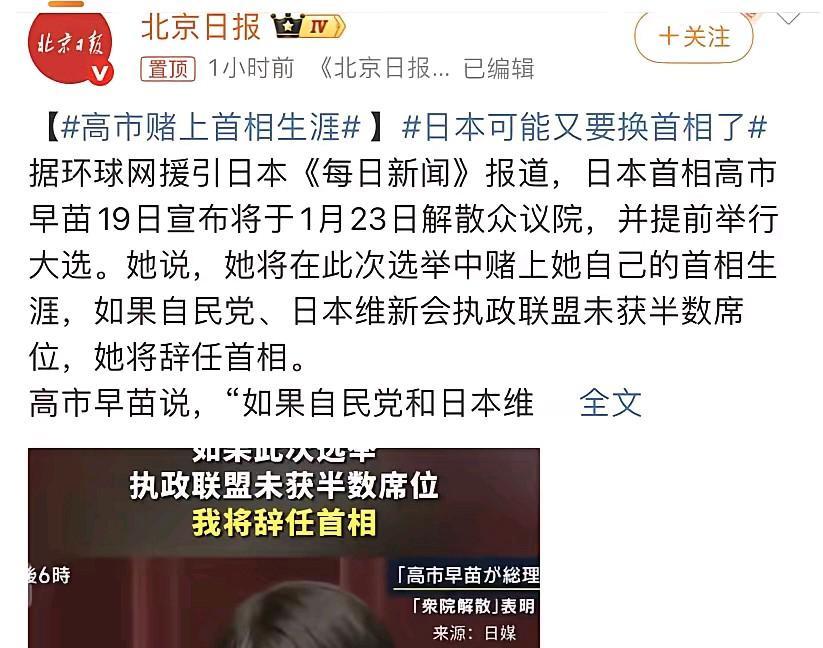 日本要换首相了?[呲牙] 自民党和联合执政的维新会如今就超过众议院半数席位了。如果解散众议院连这个都达不到,她还能解散吗? 高市早苗已经把牌亮出来了。昨晚她开了记者会,确定1月23日解散众议院。2月8日就投票,急得很。她才当了三个月首相,位置没坐稳就敢这么干,这是要赌一把大的。 她为什么这么急?说的话挺好听,说要让国民来评判联合执政和财政政策。说白了,就是自民党自己撑不住了。去年参议院选举输得太惨,两个院都没拿到多数,这是1955年来的头一回。现在拉着维新会才勉强在众议院过半,就多一席,随时会垮。 更麻烦的是国会马上要审年度预算了。一到三月,首相和部长们天天得去国会接受质问。现在物价涨、经济差、还有政治献金丑闻,高市早苗之前乱说话也让中日关系紧张。哪一条都能让她的支持率往下掉。现在解散国会,明摆着就是想躲开这些麻烦。 她赌的就是时间。趁着大家对她还有点新鲜感,支持率还没彻底崩盘,赶紧选举。要是自民党自己能赢回众议院多数,哪怕只是多拿点席位,她就不用再看小党脸色,想推什么政策都容易。 她想推的政策可不简单。高市早苗是出了名的右翼,想接着走安倍的路子。她已经在盘算一件事:2026年前全面放开日本武器出口,连攻击性武器都可能卖。这事需要绝对的控制力才能办成。 这么一赌,国家的事就得往后放。预算肯定审不完,新财年(4月开始)的钱可能批不下来。在野党骂她制造“政治空白”,为了自己那点权力不管老百姓死活。现在天这么冷,有些地方还下大雪,学生正要考试,搞突然选举真不是时候。 回到开头那个问题:要是选了以后席位更少,她还能解散吗?按宪法她能这么干,但能这么干不代表就该这么干。高市早苗用行动告诉我们:她敢。 可这招到底会让她站稳脚跟,还是让她变成又一个短命首相,2月8日投完票就知道了。2009年麻生太郎也玩过提前解散,结果输得一塌糊涂,直接丢了政权。 各位读者你们怎么看?欢迎在评论区讨论。