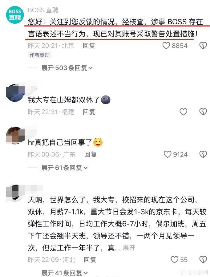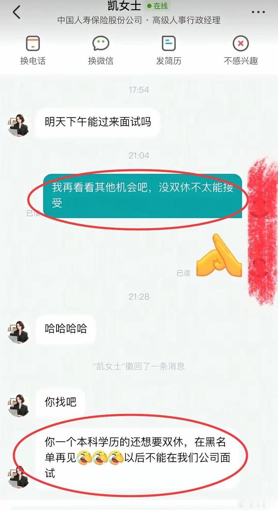 按照这个HR的意思,本科学历不配双休,那么专科学历就一个月都不配休息?或者说,硕士学历就配得上双休,博士级以上学历可以配得上一周三天休息?这种公然歧视劳工、违反劳动法的言辞,居然能堂而皇之的说出口,确实令众人见识了“民族企业”的下限,究竟可以有多低。该说不说啊,为啥在中国最遵守劳动法的,反而是一些外企?佳能、日产、现代等等工厂撤退裁员,能给到的补偿都能达到2N以上,从高管到一线员工,相当一部分都能落实双休,无法双休的也都能安排调休;特斯拉上海工厂对员工的待遇,更是全国第一档。高下立判!HR讽刺求职者本科学历不配双休