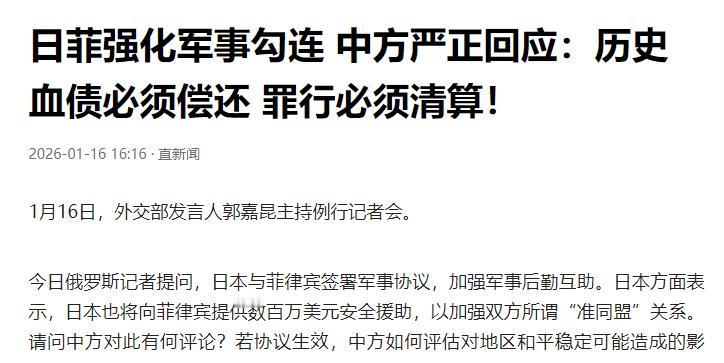 在北京的外交部例行记者会上,郭嘉昆发言人罕见地抛出六个字,“血债必须偿还”;紧接着,又一句“罪行必须清算”掷地有声。 2026年1月16日的北京,外交部例行记者会上气氛格外凝重。郭嘉昆发言人面对日菲军事合作的提问,抛出了振聋发聩的六个字“血债必须偿还”。紧接着,他再补一句“罪行必须清算”,字字千钧掷地有声。现场外媒记者纷纷低头疾笔记录,没人敢轻视这场外交表态的“突变”。这两句话直接将本就紧张的中日关系推向了新的节点,更藏着中国对日本长期挑衅的忍无可忍。 熟悉中国外交风格的人都清楚,我们向来以克制理性立足国际舞台。“严正关切”“严正交涉”这类措辞,是过去应对各类摩擦的常态表达。郭嘉昆发言人此次改用如此沉重决绝的话语,绝非一时兴起的情绪宣泄。这是日本近年在军国主义复活道路上步步紧逼、反复触碰中国红线后,必然引发的外交反击。这更是历史伤痛与现实挑衅交织叠加,中国再也无法退让的底线宣告。 八十多年前,日本军国主义发动的侵华战争,给中国人民留下了刻入骨髓的灾难。从1931年“九一八”事变到1945年战败投降,十四年时间里,日军铁蹄踏遍了中国三分之二以上的领土,蹂躏了二十一个省份。全面侵华的八年里,中国百分之八十以上的大城市落入日军之手,山河破碎民不聊生。 日军的暴行更是罄竹难书。1937年12月13日,日军攻陷南京后,制造了震惊世界的大屠杀惨案。短短六个星期内,三十多万手无寸铁的无辜民众惨遭杀害,数万妇女被蹂躏残害,南京三分之一的建筑被焚毁,街头到处都是尸横遍野的惨状。这种反人类的罪行,成为人类历史上最黑暗的一页。 不止南京,日军的屠刀遍布中华大地。1941年1月25日,日军闯入河北丰润潘家峪,一口气枪杀了一千七百零三名平民,烧毁一千一百多间房屋,整个村庄瞬间变成人间地狱。在华北地区,日军推行“杀光、烧光、抢光”的三光政策,仅晋察冀等七个解放区,就有三百一十八万人被杀害或虐待致死,两百七十六万人被强行抓走,近三百万人家破人亡肢体伤残。 日军还丧心病狂地使用细菌和化学武器。臭名昭著的731部队,把中国平民当作活体实验对象,仅这一支部队就有至少三千人死于细菌试验。他们在无麻醉状态下进行活体解剖,给孕妇注入病菌观察胎儿反应,手段残忍到令人发指。化学武器方面,日军在中国十九个省区使用毒气达两千零九十多次,造成约二十万中国军民中毒伤亡,战后还遗弃了两百万发毒气弹,至今仍威胁着中国民众的安全。 这些血与泪的历史,每一个中国人都刻骨铭心。可如今的日本,不仅没有丝毫忏悔之意,反而在军国主义复活的道路上越走越远。日本防卫大学竟把参拜靖国神社当作传统,学生四年就学期间至少要参加一次前往靖国神社的夜行军,而这座神社里正供奉着东条英机等七名甲级战犯的亡灵。 自卫队与靖国神社的勾结更是明目张胆。2024年1月,时任陆上自卫队幕僚副长小林弘树,率领数十人乘公务车参拜靖国神社。事件曝光后,防卫省仅以“私人参拜”为由轻描淡写训诫了事,今年三月小林弘树还升任了陆上自卫队总司令。更离谱的是,靖国神社的“游就馆”被包装成自卫队的历史教育基地,自卫队干部穿着制服去参观参拜,还辩称是“研修间隙的私人行为”。 日本还在刻意篡改历史、美化侵略。防卫大学的必修教材把侵华战争歪曲为“对欧美列强侵略亚洲的自卫”,公然使用“大东亚战争”这种美化侵略的措辞。前海上自卫队将领还出任了靖国神社宫司,十人的顾问决策机构里就有两名前自卫队参谋长,军国主义思想正全面渗透日本军事体系。 与此同时,日本不断扩军备武、输出杀伤性武器,和菲律宾签署军事合作协议,妄图构建军事同盟。日方的一系列举动,都暴露出右翼势力推动“再军事化”、重走扩张老路的野心。东南亚国家和国际社会对此批评不断,可日本非但不收敛,反而变本加厉挑衅周边国家。 郭嘉昆发言人的强硬表态,正是对这种现状的有力回击。中国的克制从来不是软弱,理性也不是无底线退让。历史的血债不能一笔勾销,日军的罪行不能被时间掩盖。日本若继续无视历史、肆意挑衅,必将为自己的行为付出沉重代价。 我们始终铭记,和平是用无数先烈的鲜血换来的。但这份和平,绝不容许日本军国主义的复活来践踏。血债必须偿还,罪行必须清算,这不仅是中国的态度,更是所有爱好和平国家和人民的共同心声。日本唯有正视历史、深刻忏悔,才能真正融入地区和平发展的大局,否则只会在错误的道路上越走越远。