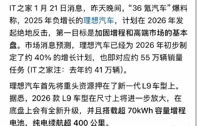 聊聊理想2026新战略,我觉得这波是真沉下心做务实布局了,没搞什么花里胡哨的噱头。这次新战略看得很明白,不盲目铺赛道了,重心拉回增程主战场,新一代L9打头阵,还把增程电池干到70kWh,纯电续航破400km,日常通勤纯电够用,长途也没里程焦虑,精准戳中家庭用户痛点。另外自研M100智驾芯片、标配5C超充,再加上要建4800多座超充站,都是在补之前的短板,同时砍掉冗余车型,不搞内耗只守40万+高端家庭盘,思路特别清。我是觉得只要守住“家庭出行无焦虑”这个根,2026年包起飞的。曝理想汽车2026新战略