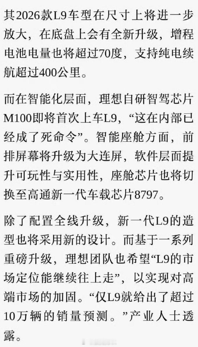 2026增程SUV市场第一之争 理想L9的信息已经透露了一部分,也很正常,因为马上就过年了,过完年就3月了,紧接着就北京车展了。啥事都得早点开始,不然到时候信息挤爆了没人看。理想L9的猜想信息:- 增程电池电量也将超过70度,支持纯电续航超过400公里。- 理想自研智驾芯片M100即将首次上车L9。- 座舱芯片也将切换至高通新一代车载芯片8797。- 底盘大有提升。照我来看,能达到理想i8的水平就相当强了,可认为是升级2代。如果更强则可认为升级更多。- 尺寸更大: 对我个人而言,这不是什么增强;但对于市场卖车来说,这是必要的优点。