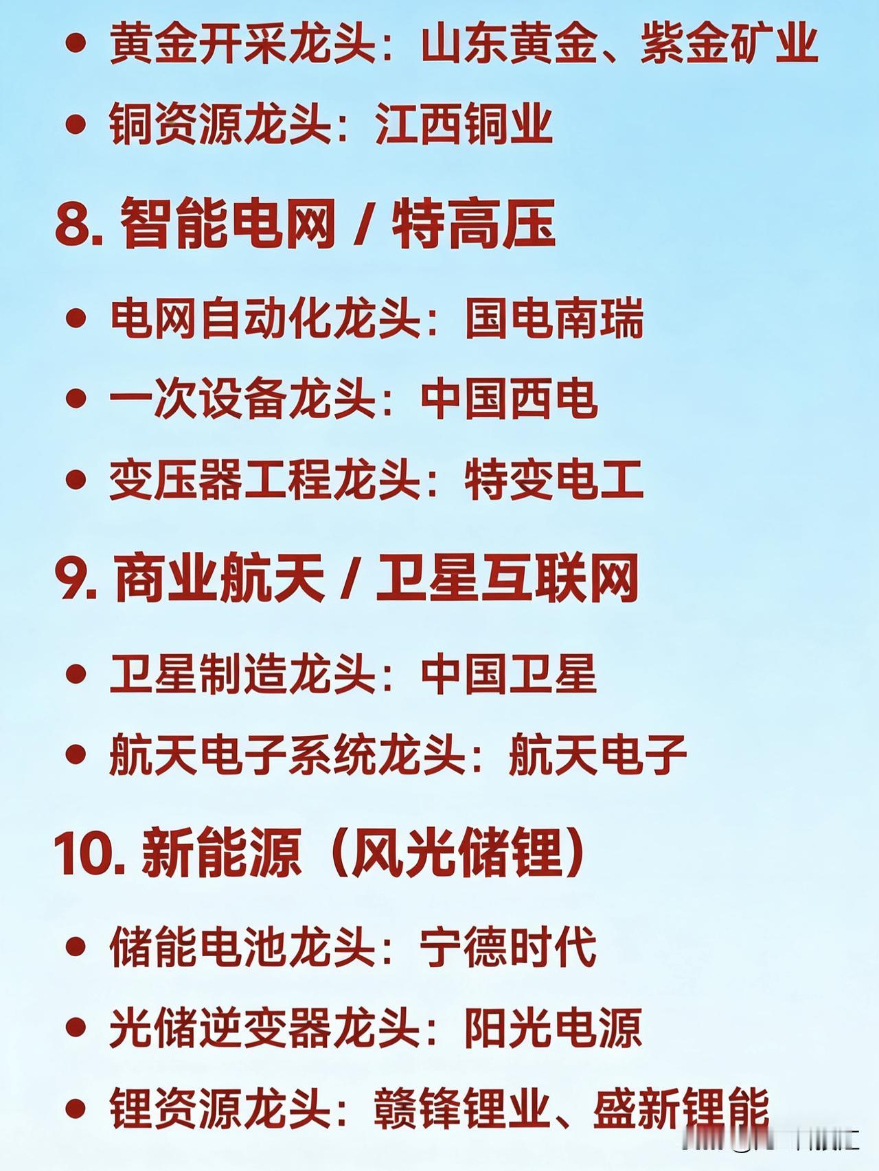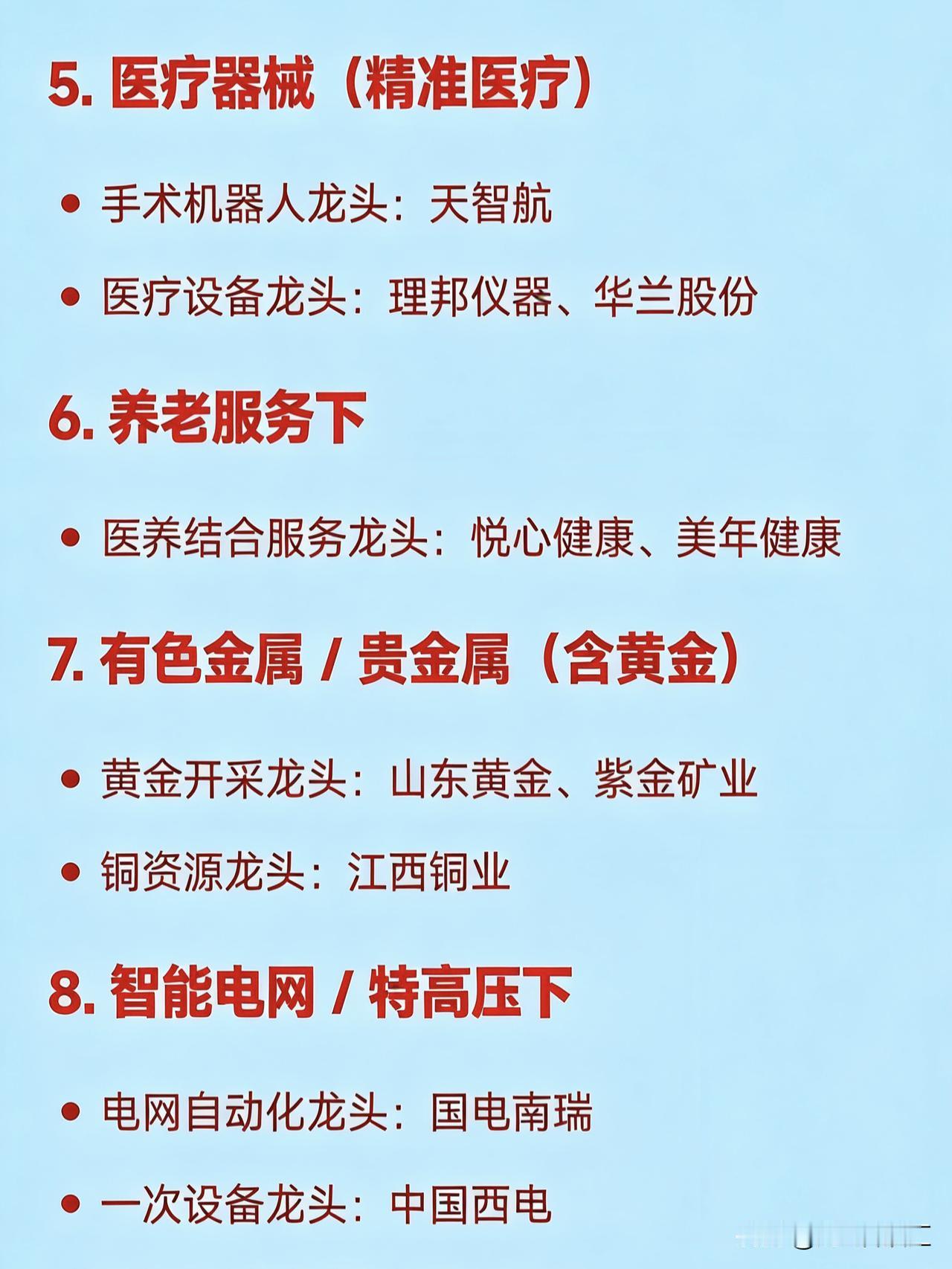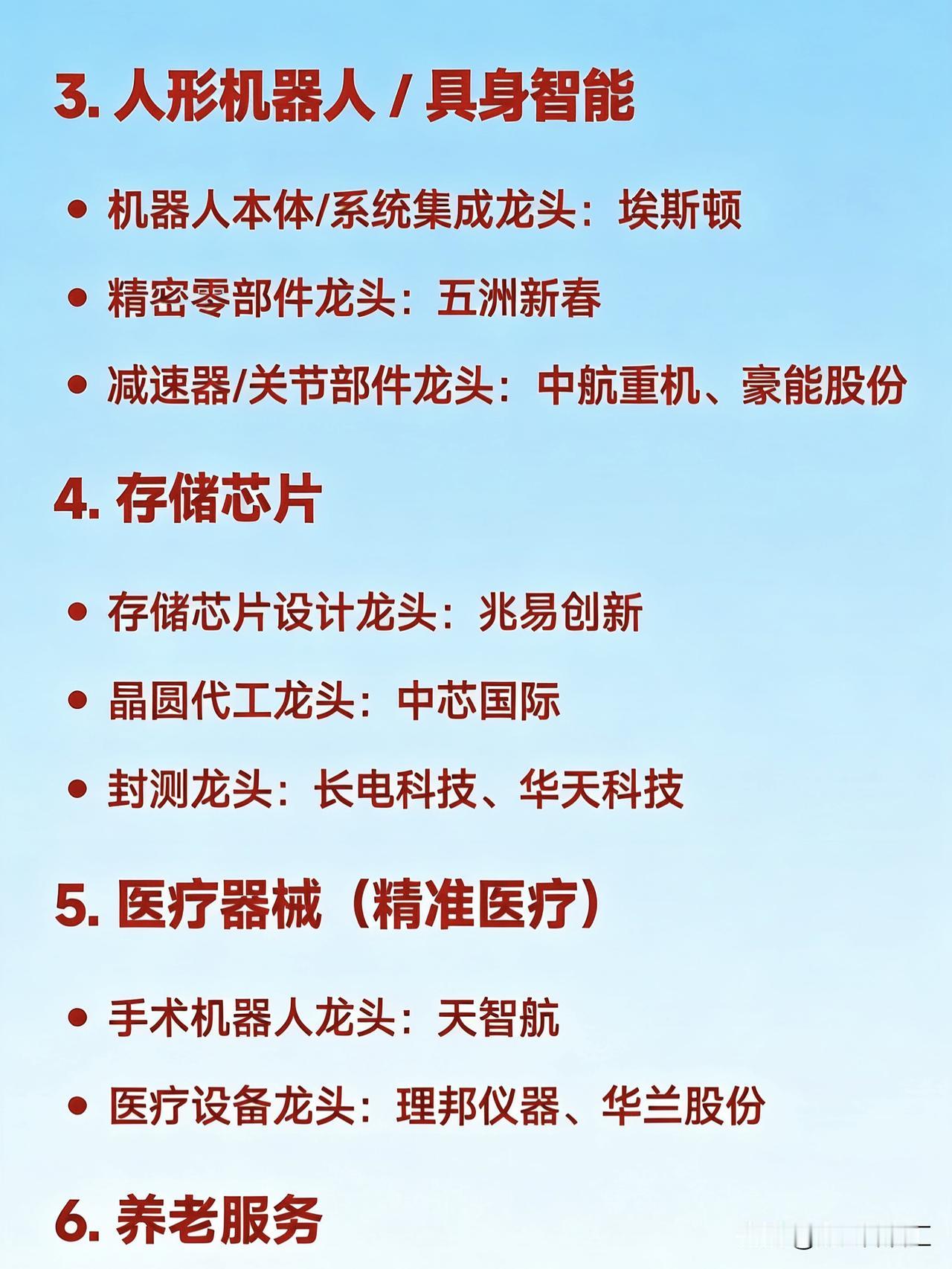 2026年1月21日十大热点科技及其产业链核心龙头 1. CPO(共封装光学) 光模块龙头:中际旭创、新易盛 光器件平台龙头:天孚通信 先进封装龙头:长电科技、通富微电 2. AI算力与服务器 AI服务器龙头:中科曙光 国产CPU/GPU芯片龙头:海光信息、龙芯中科 3. 人形机器人 / 具身智能 机器人本体/系统集成龙头:埃斯顿 精密零部件龙头:五洲新春 减速器/关节部件龙头:中航重机、豪能股份 4. 存储芯片 存储芯片设计龙头:兆易创新 晶圆代工龙头:中芯国际 封测龙头:长电科技、华天科技 5. 医疗器械(精准医疗) 手术机器人龙头:天智航 医疗设备龙头:理邦仪器、华兰股份 6. 养老服务 医养结合服务龙头:悦心健康、美年健康 7. 有色金属 / 贵金属(含黄金) 黄金开采龙头:山东黄金、紫金矿业 铜资源龙头:江西铜业 8. 智能电网 / 特高压 电网自动化龙头:国电南瑞 一次设备龙头:中国西电 变压器工程龙头:特变电工 9. 商业航天 / 卫星互联网 卫星制造龙头:中国卫星 航天电子系统龙头:航天电子 10. 新能源(风光储锂) 储能电池龙头:宁德时代 光储逆变器龙头:阳光电源 锂资源龙头:赣锋锂业、盛新锂能