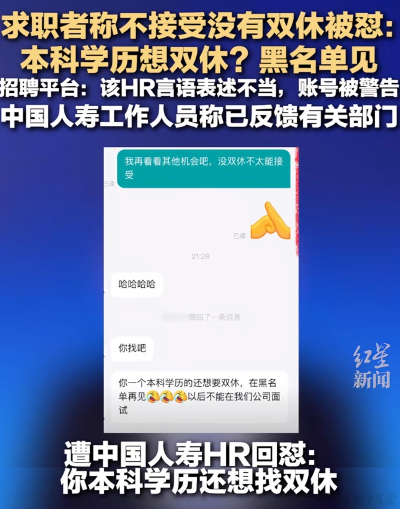 属于是干HR干出优越感来了,有网友在和中国人寿HR求职沟通的时候表示,没双休不太能接受,谁想HR讽刺求职者本科学历不配双休,并且还要拉入黑名单,以后不能在她们公司面试。我寻思打工人何必为难打工人,意思这年头上班想要个双休是什么很过分的要求吗?
