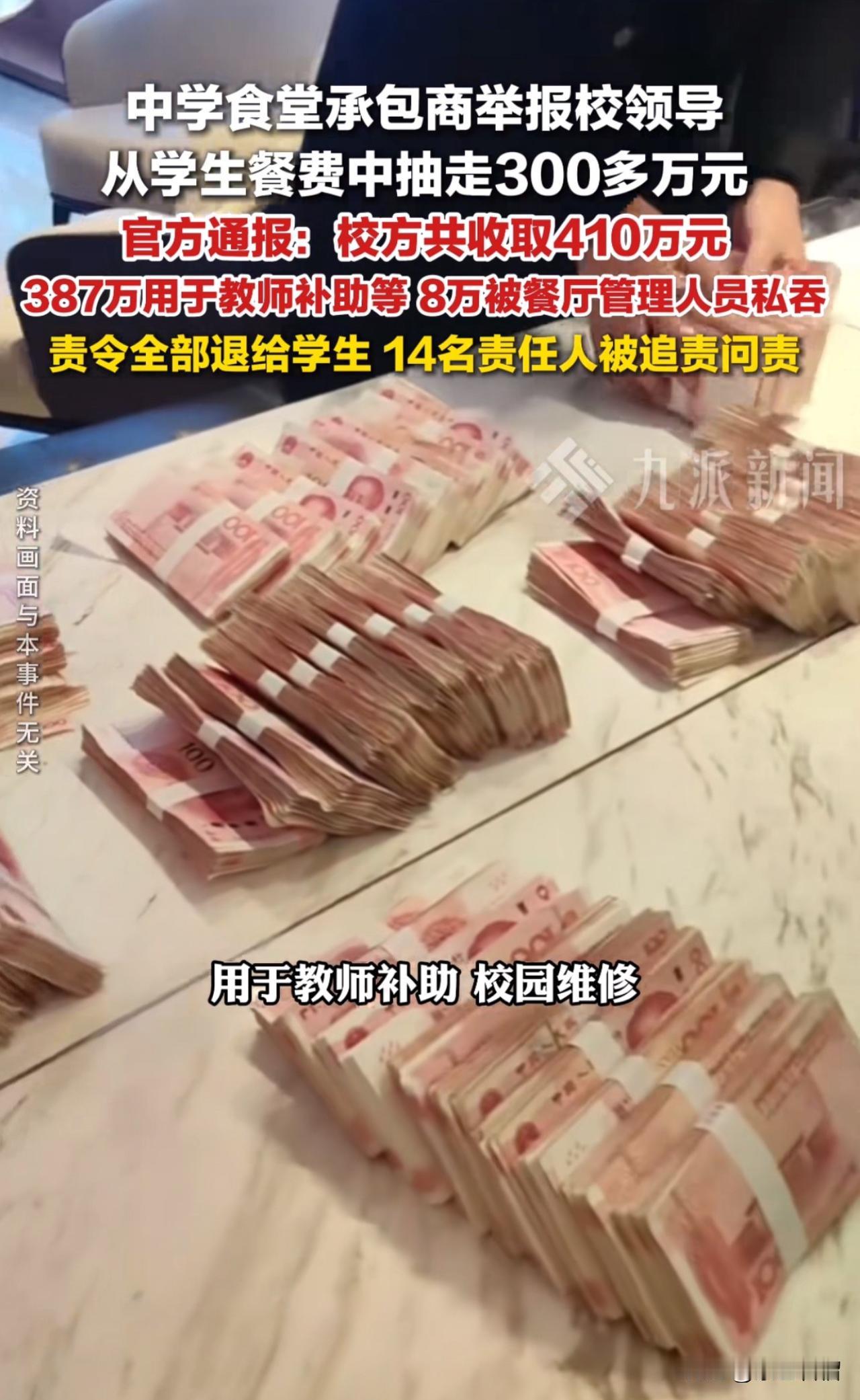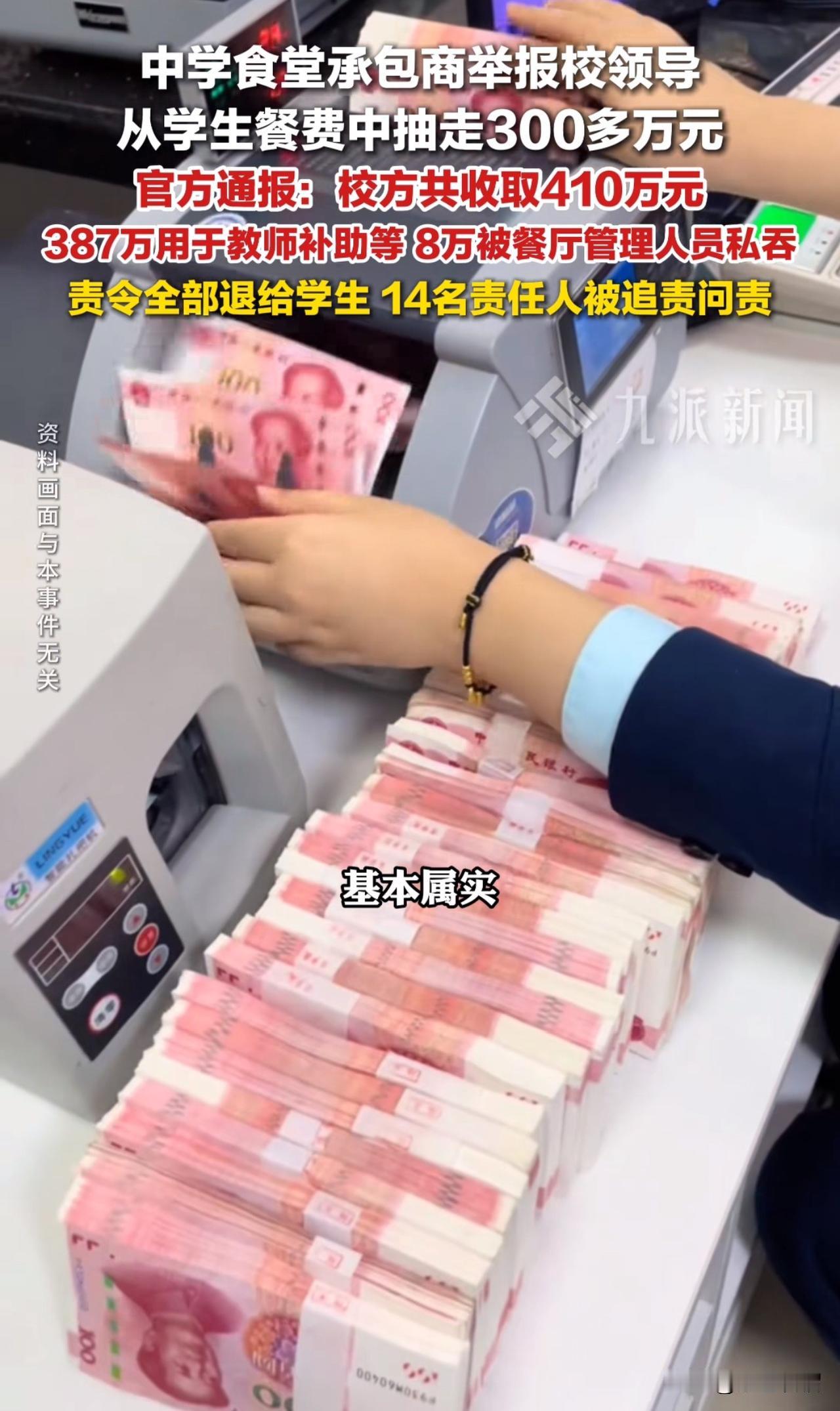 这所中学的校领导简直是胆大包天! 竟然从学生餐费里抽走400多万,其中387万用于给教师发放福利和补助,8万被餐厅管理人员非法侵占。你们把学生的伙食费拿去发补助,自己腰包鼓了,日子舒坦了,可学生还能吃得好吗?这简直就是雁过拔毛啊! 如今,相关部门责令这所学校将伙食费全额退还给学生,同时14名责任人被追责问责,私吞8万元的职工也被双开。 对于此事,大家怎么看?欢迎在评论区交流。 (图片来源网络)