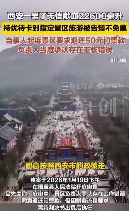 这世界需要这些较真的人,西安市民吕先生起诉景区,不给献血人员免除50元的门票钱。他累计无偿献血57次,总量达22600毫升,荣获全国无偿献血奉献金奖,却在指定优待景区旅游时被拒免票,吕先生将涉事景区经营者诉至法庭。吕大哥较真的哪是五十块钱?他是为了制度信用的修复。 他十年献血量相当于全身换血 4 遍多,捧回国家金奖和西安市发的 "荣誉 A 卡",政策白纸黑字写着持卡可免市属 A 级景区门票。结果去年 12 月带父母去景区,工作人员一句 "没接到通知" 就把他挡在门外。 《西安市献血条例》优待政策是累计献血2000毫升以上,或获得国家无偿献血奉献奖者,可享受“三免”待遇:“市属A级景区免票”、“免费乘坐公共交通”、“免交公立医疗机构普通门诊诊察费”。 政策落地总在最后一公里卡壳,寒的是千万献血者的心。今天能对献血者耍赖,明天就敢把其他优待政策当草纸。