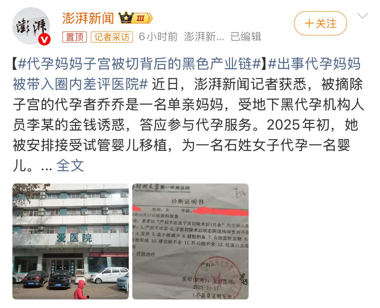 最近,河南平顶山发生了一起令人痛心的代孕事件——一名代孕妈妈在分娩时突发大出血,子宫被紧急切除,而背后牵扯出的黑色产业链更是让人触目惊心。 这位代孕妈妈名叫乔乔,是个单亲妈妈,她被地下黑代孕机构用金钱诱惑,答应为一名石姓女子代孕,从接受试管婴儿移植开始,乔乔就被代孕机构统一安排,住进了一处居民小区的三居室,同住的还有另外两名代孕孕妇,在这长达九个月的妊娠期间,她们被严格限制活动,不仅不能随便下楼,更严禁结伴外出,仿佛被囚禁在了一个无形的牢笼里,到了分娩的时候,代孕机构不顾乔乔的意愿,将她安排到了平顶山博爱医院,这家医院在代孕圈里早就臭名昭著,分娩条件简陋,医疗服务质量差,可即便如此,乔乔还是被推进了手术室,生产过程中,她突发大出血,陷入了昏迷,几天后,当她再次醒来时,发现自己已经身处郑州大学第一附属医院的ICU抢救室内,身上插满了各类抢救管路,更让她震惊的是,自己的子宫已经被切除了。原来,乔乔在博爱医院分娩时,由于医疗条件差,加上代孕本身的高风险,导致她大出血不止,为了保住她的生命,医生不得不做出了切除子宫的决定,而这一切,代孕机构却对乔乔隐瞒了真相,甚至在她醒来后还谎称是大出血是顺产转剖宫产所致。 这起事件背后,隐藏着一个庞大的黑色产业链,从招募代孕妈妈,到进行试管婴儿移植,再到安排分娩,每一个环节都充满了罪恶,代孕机构为了谋取暴利,不惜将女性的子宫当作商品,将生命当作货物。他们用金钱诱惑那些经济困难的女性,让她们在不知情的情况下沦为生育工具,而这些女性,往往在经历了身体和心理的双重伤害后,还被无情地抛弃。更可怕的是,这样的黑色产业链并不是个例,在长沙、青岛等地,都曾曝光过类似的代孕黑窝点。这些窝点里,代孕妈妈们被明码标价,根据年龄、学历、身体状况等不同条件,价格从几十万到上百万不等,而一旦代孕妈妈生下的孩子不符合客户的要求,就会被直接遗弃,甚至流入器官买卖市场。代孕不仅是对女性身体的摧毁,更是对生命的漠视和社会伦理的崩塌。它让女性的子宫成了“生产工具”,让孩子成了“商品”,而背后的中介却拿着高额利润,不管女性的死活,不管孩子的未来,国家早就明确禁止代孕,可由于处罚轻、监管难等原因,这样的黑色产业链依然屡禁不止。 这起事件给我们敲响了警钟,我们必须坚决抵制代孕,保护每一个可能被金钱吞噬的女性,保护每一个无辜的生命。非法代孕 严查代孕罪恶链 黑暗代孕 严打代孕产业链 事件来源:澎湃新闻