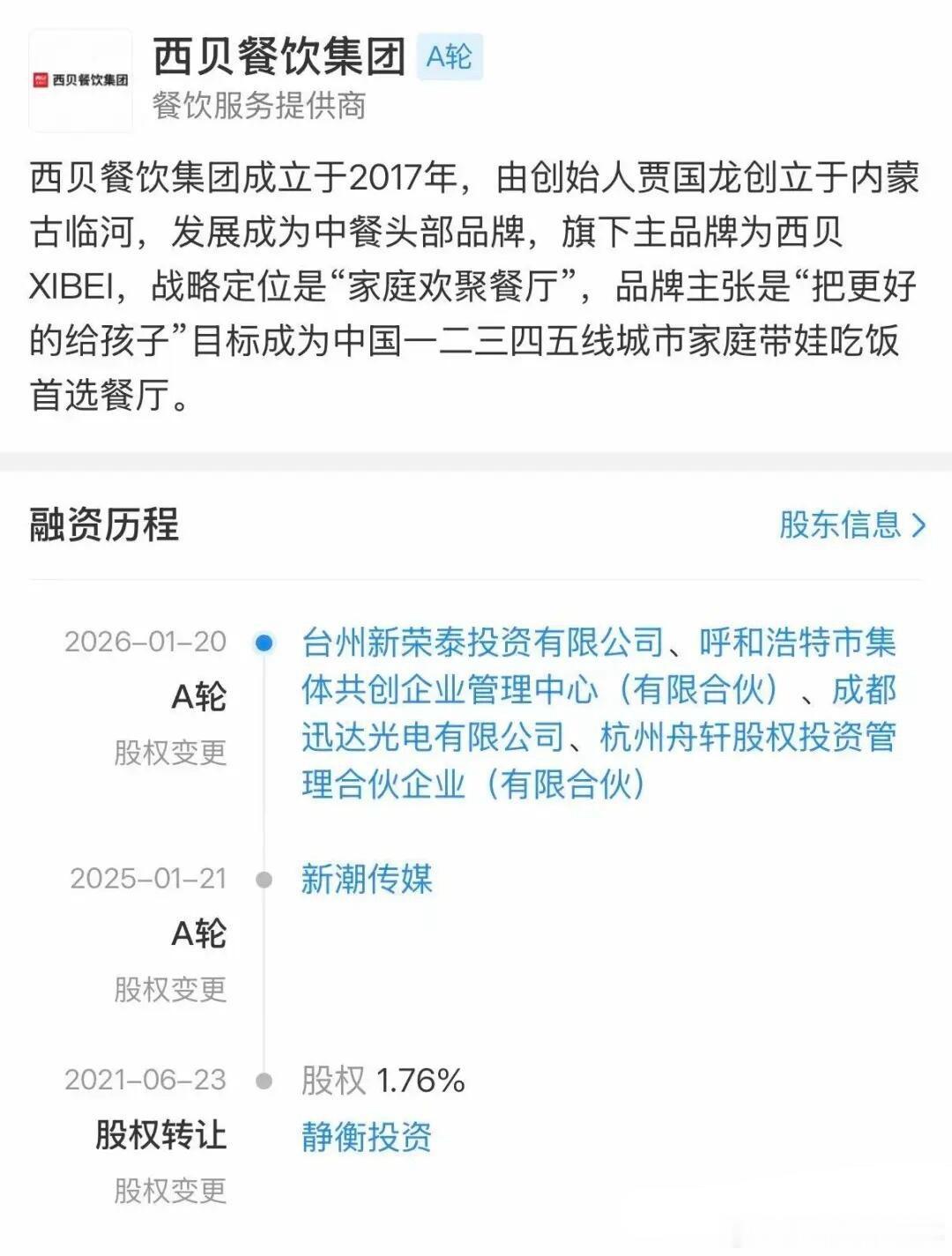 和罗永浩刚吵完,关店102家的西贝就融资了。和罗永浩的嘴仗刚落下帷幕,西贝注册资本就由0.89亿元增至约1.02亿元人民币,增资比例为13%·新增股东中有台州新荣泰投资有限公司、呼和浩特市集体共创企业管理中心(有限合伙)、杭州舟轩股权投资管理合伙企业(有限合伙)、成都迅达光电有限公司等。·前些日子贾国龙确认,公司计划于2026年第一季度关闭全国约102家门店,约占门店总数的3成,涉及员工约4000人。·