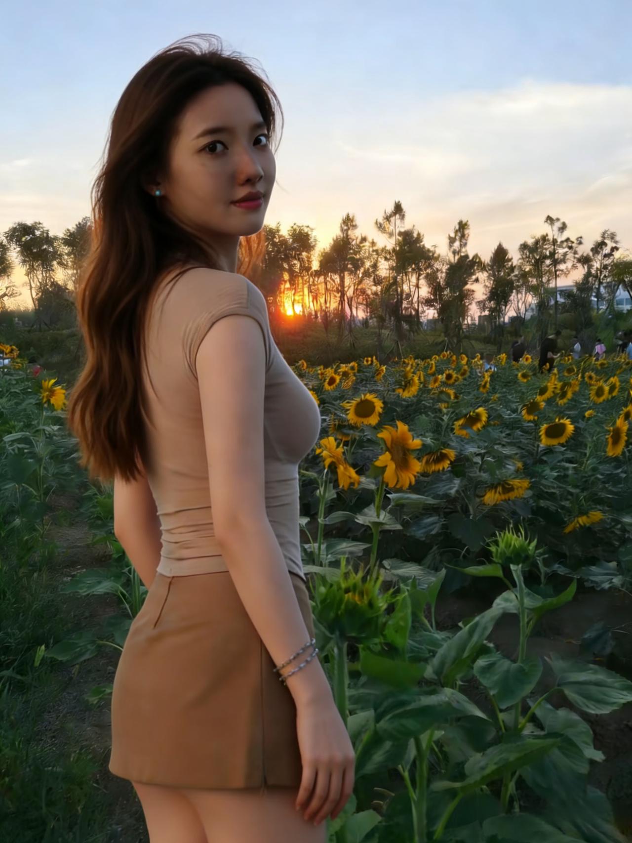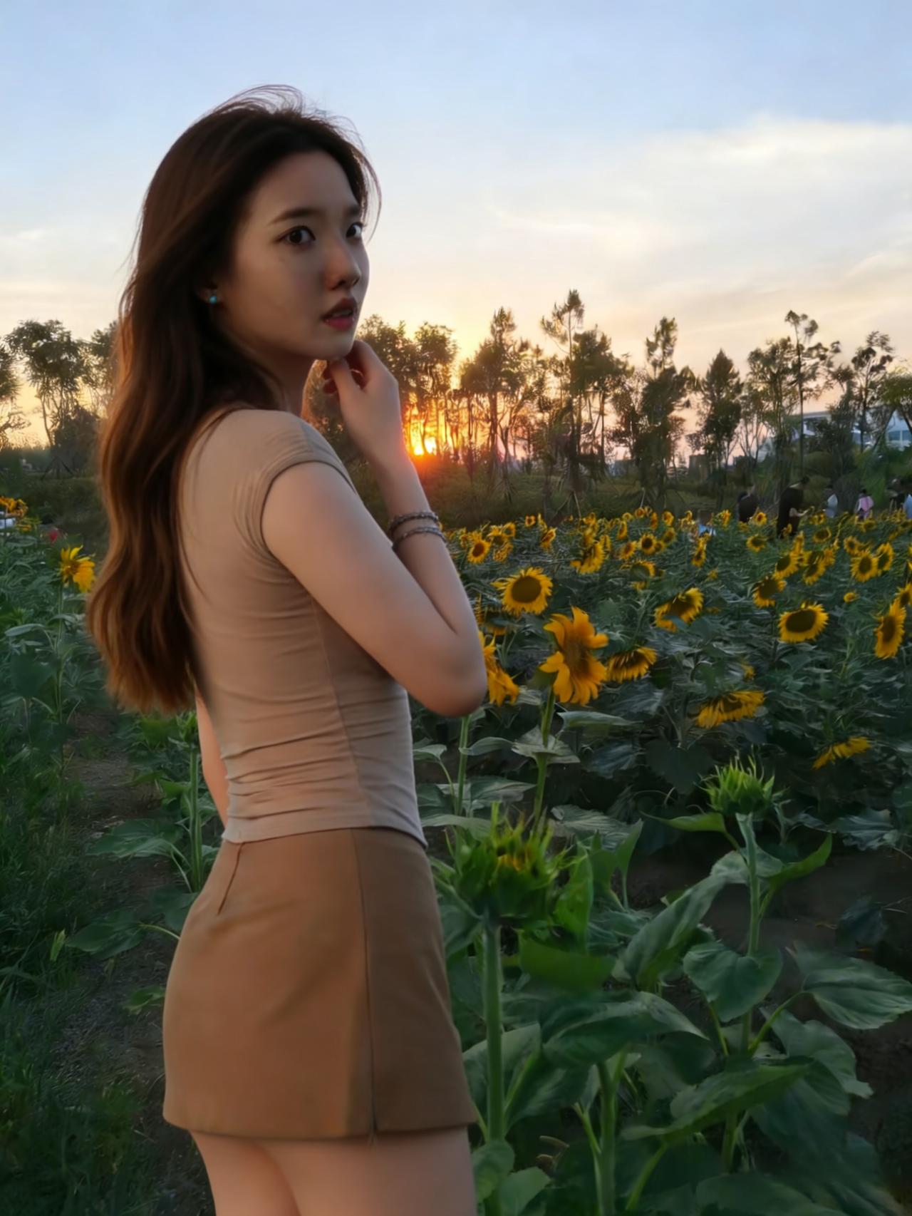 葵田万顷接天黄,落日熔金覆野塘。 风动花波翻细浪,霞飞草色染轻霜。 佳人伫立凝眸久,衣袂飘举带暗香。 归鸟投林烟渐暝,余情脉脉系斜阳。