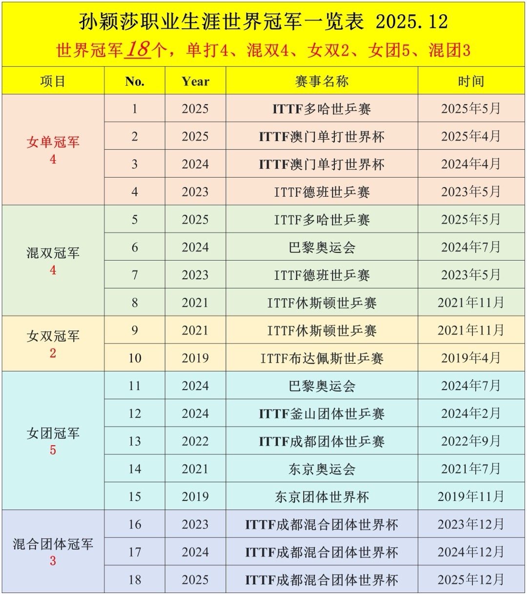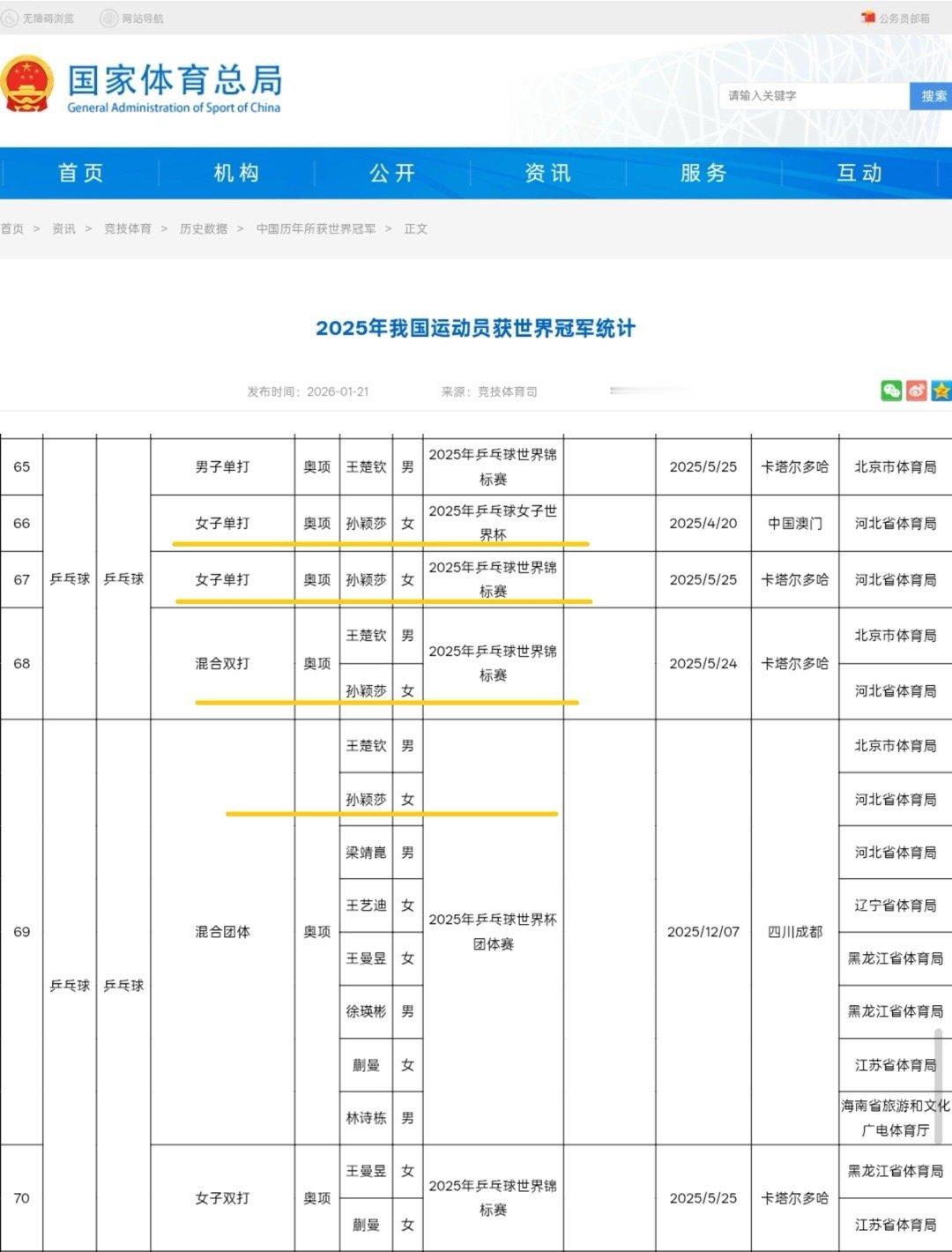国乒2025获6个世界冠军国乒2025共获得.世冠6冠孙颖莎占4冠🐮体总官网发