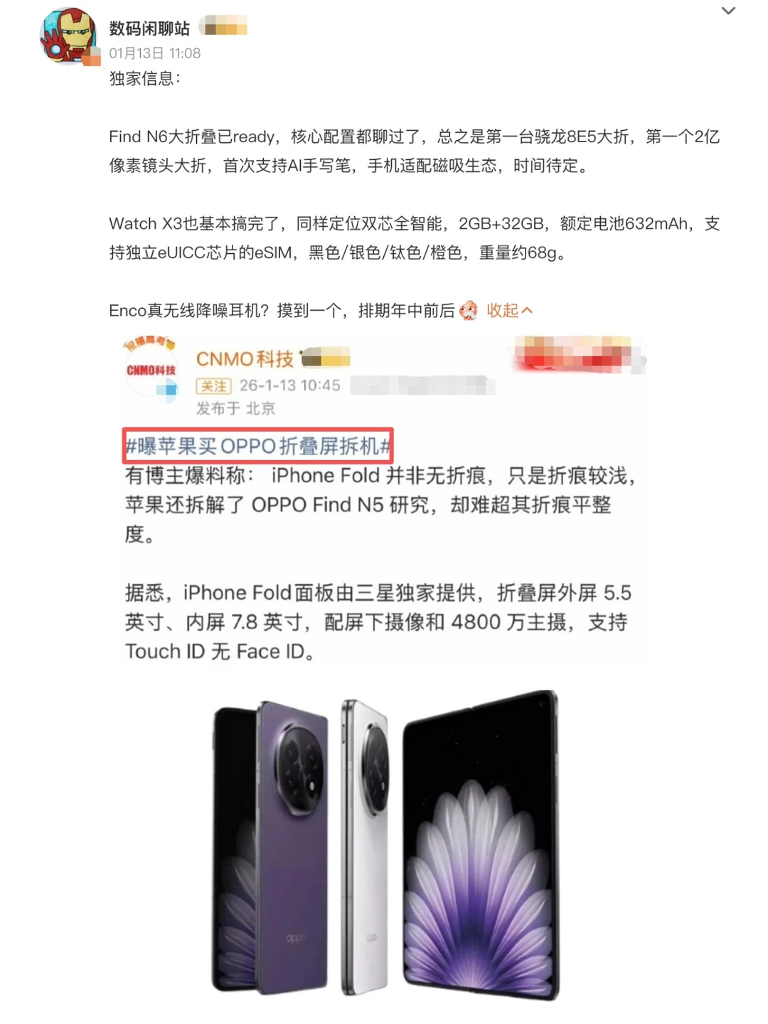 说实话,大家应该蕞期待苹果折叠屏吧,据说形态像一台小iPad mini,屏幕折痕巨浅,不过国产折叠屏已经发展很多年了,前段时间还爆出苹果拆了台OPPO Find N5研究,发现折痕控制还不如OPPO,上了热搜。这很难让大伙信任苹果的折叠屏啊。