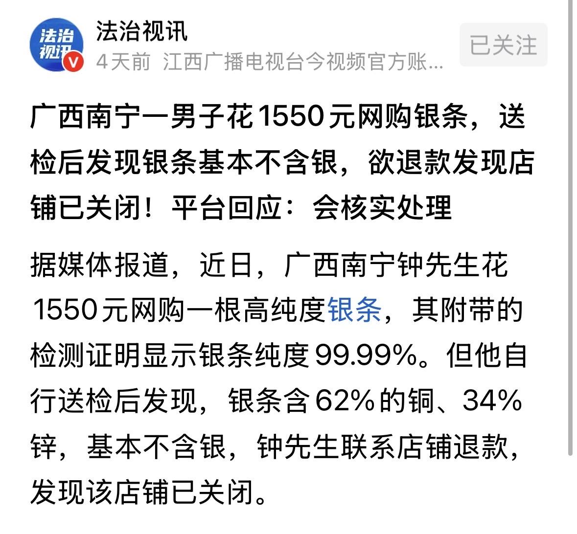广西南宁,男子在网上花1550元买了一根高纯度银条,卖家出示的证明上显示银条纯度99.99%,男子收到货觉得手感太轻,就自行送检,结果检测结果让他大吃一惊,银条含铜 62%,含锌 34%,基本不含银!男子联系卖家退款,却发现店铺早已关店跑路,男子这下傻眼。 钟先生在网上转悠,看中了一款标价1550元的银条。 卖家那宣传做得是相当漂亮,页面上写着纯度99.99%,随货还附带一张看着挺正规的检测证书。 钟先生寻思着,现在的金价银价都透明,这价格虽然不算捡漏,但只要东西保真,也算合理。 再加上那张检测证书在那摆着,钟先生没多想,手一点,付款了。 快递到的那天,钟先生心里还挺美,想着怎么也是1000多块钱的东西,得好好验验。 他拆开包装,拿出那根银条,乍一看,亮闪闪的,似乎没啥毛病。 但钟先生是个细心人,他把银条拿在手里掂了掂,总觉得这手感不对劲,太轻了,不像纯银那种沉甸甸的感觉。 该不会是假货吧?钟先生坐不住了,专门跑了一趟正规的珠宝检测机构,自掏腰包做了一次复检。 这一检,真是不检不知道,一检吓一跳,差点把钟先生的鼻子气歪了。 检测报告出来那一刻,工作人员看他的眼神都带着同情。 报告上清清楚楚写着,这根所谓的99.99%纯银条,银含量微乎其微,基本可以忽略不计。 里面主要成分是啥呢?62%的铜,34%的锌,还有点别的杂质。 说白了,这就是一根典型的黄铜棒,表面镀了一层银膜,专门用来忽悠人的! 钟先生拿着报告不淡定了,1550块钱啊,不是大风刮来的,他第一反应就是赶紧找卖家算账。 他打开购物软件,点进那家店铺,还想着要先骂两句出出气。 结果,页面竟显示该店铺已关闭。 没有任何预告,没有任何公告,就像这店家早就预料到会东窗事发,卷了钱直接跑路了。 那种感觉,就像是一拳打在棉花上,有力没处使。 这时候钟先生才反应过来,自己这是掉进了典型的打一枪换一个地方的无良商家陷阱里了。 人家根本就没打算做长久生意,骗一波快钱就注销店铺,换个马甲继续骗下一波。 没办法,钟先生只能转头找网购平台。他把检测报告、聊天记录、店铺关闭的截图一股脑全发给了平台客服。 客服表示,您的情况我们已经记录了,我们会尽快核实处理的,请您耐心等待。 核实处理,这四个字钟先生听得耳朵都起茧子了。他心里明白,这可能就是平台的拖延战术。 店铺都关了,保证金退没退都不知道,平台真要赔这钱,那是割平台的肉,他们能痛快吗? 钟先生现在的心理就是两个字:焦虑。 他焦虑这1550块钱能不能追回来。虽然钱不算天文数字,但也是他辛苦挣的钱。 更让他气愤的是这种被当成傻子耍的感觉。如果自己当时没去复检,他永远都被蒙在鼓里。 现在的局面很尴尬。卖家跑了,平台在走流程,报警吧,金额1550元够不够立案标准还两说,警察大概率也是建议走民事诉讼或者平台介入。 可为了这1000多块钱去法院起诉,费时费力,还不一定能找到被告。 钟先生把这事儿曝光,也是想提醒大家,网购贵重金属,哪怕有证书,到手也得去复检。现在的造假技术,别说仿个证书,就是仿个钢印都跟玩儿似的。 截止到目前,平台那边还没给出最终的赔付方案,只是说正在核实。 这事儿还没完,钟先生表示,如果平台最后不给个说法,他就准备打12315投诉。 那么,从法律角度怎么看? 《消费者权益保护法》第55条第1款规定:经营者提供商品或者服务有欺诈行为的,应当按照消费者的要求增加赔偿其受到的损失,增加赔偿的金额为消费者购买商品的价款或者接受服务的费用的三倍。 商家附带了伪造的“检测证书”,标称纯度99.99%。这说明商家明知这是假的,却故意虚构事实、隐瞒真相。 正是因为这张假证书和虚假宣传,钟先生才陷入错误认识,以为自己买的是真银条并支付了1550元。 如果只是纯度稍微差点,可能算违约。但这里面62%是铜,基本不含银,这就是赤裸裸的以次充好、以假充真,属于典型的欺诈行为。 根据法条,如果钟先生走法律程序,不仅可以拿回自己的1550元,还可以要求商家额外赔偿三倍的价款,也就是1550元 × 3 = 4650元。 对于钟先生来说,虽然维权过程麻烦,但如果真能拿到这笔赔偿,不仅挽回了损失,连维权的交通费、检测费都赚回来了,甚至还有精神损失费的补偿。 可如今店铺关了,找谁赔? 根据《消法》第44条,如果平台不能提供销售者的真实名称、地址和有效联系方式,消费者可以要求平台先行赔付。 如果是在电商平台买的,平台有责任协助维权。 对此,你怎么看? 关注@运良说法 学法律知识不迷路