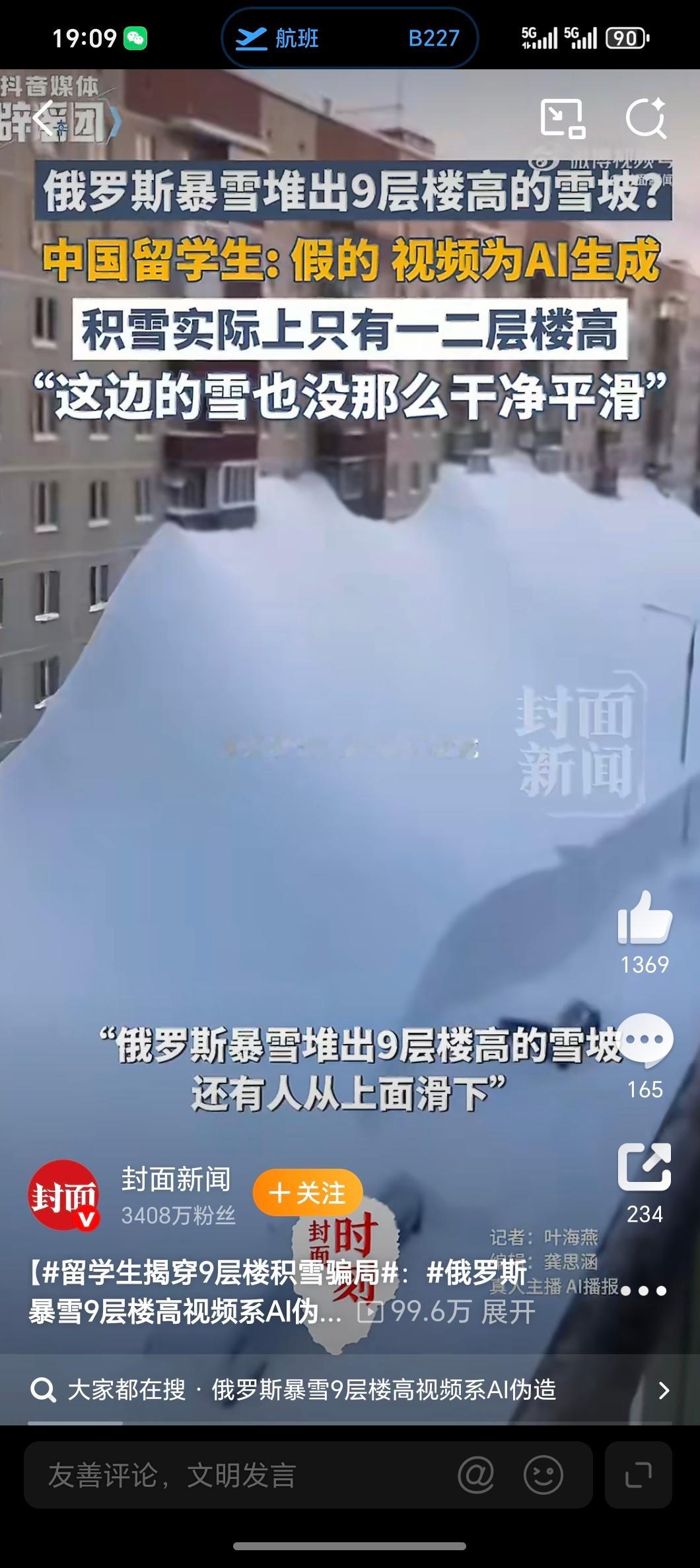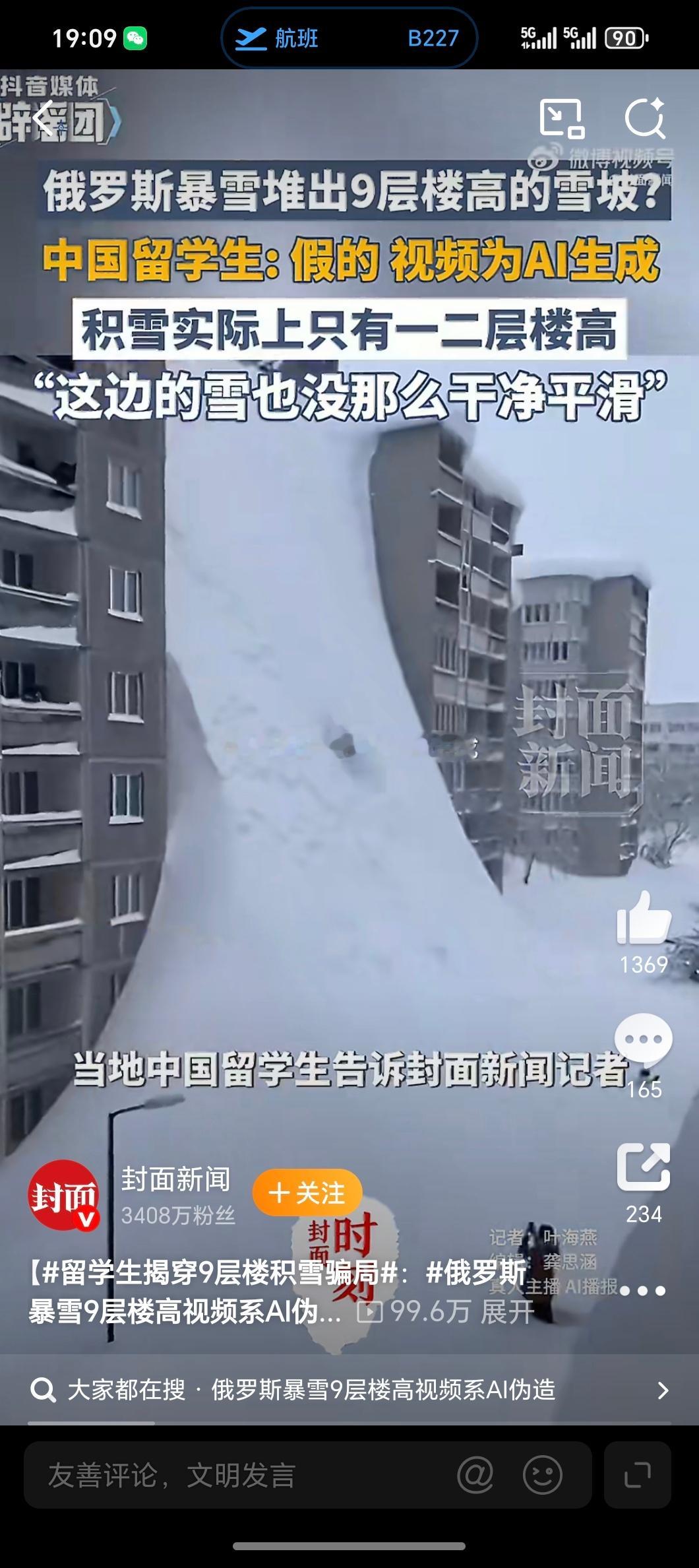 留学生揭穿9层楼积雪骗局好家伙现在AI视频的逼真程度越来越高!当地中国留学生实拍打假,9层楼积雪的震撼视频真实积雪仅2米多,AI合成的雪面干净平滑,还藏着窗户“漂浮”、雪橇违反物理滑行的破绽实际当地正遭60年一遇暴雪,居民扒雪开路、道路瘫痪,甚至有人遇难。拿灾难当流量密码太无底线!AI时代需要更与时俱进的监管,遇到离谱内容多留个心眼