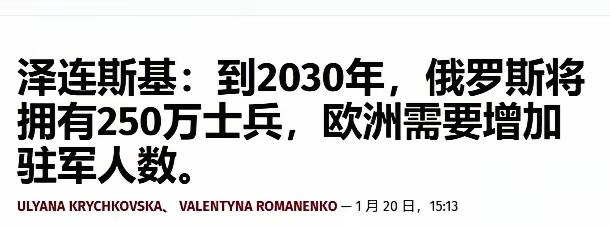泽连斯基有话说,欧洲的安全和抗俄不是我乌克兰一家的事!20日他喊话欧洲称,俄罗斯计划2030年组建200-250万人的军队,欧洲得赶紧跟进,并要求欧洲扩军300万。可这提议他去年就提过,可压根没人搭理。乌克兰《真理报》消息。 要知道,北约成员国连2035年国防开支达GDP5%的承诺都拖拖拉拉,现在大多还低于3%,经济、财政、社会层面都扛不住百万扩军。说白了,特朗普和欧洲因格陵兰岛闹得不可开交,泽连斯基怕被边缘化,才拿“抗俄”当噱头,想重新绑住欧洲的援助。安全确实不是乌克兰一家的事,但这种异想天开的要求,终究只是博关注的噱头。