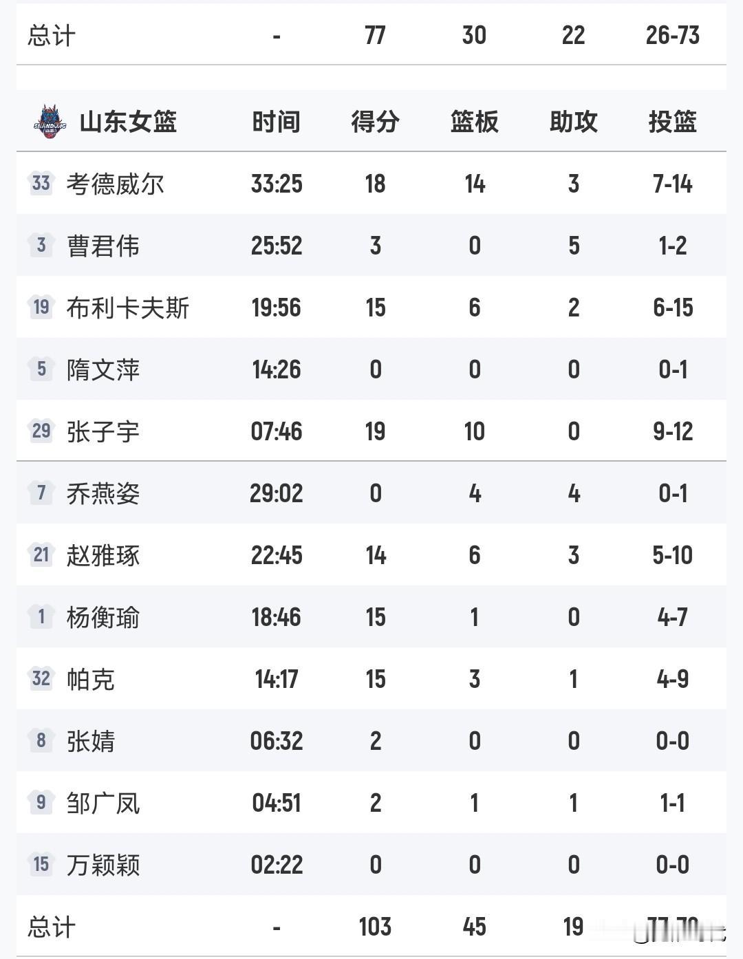 张子宇19+10 赵雅琢14+ 杨衡瑜15+ 山东女篮胜陕西女篮