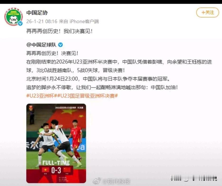 现在,足协也感到脸上有光,直接送上祝福 后面的决赛现场,足协头头们会不会现场督战呢 毕竟,这也是给足协长脸 这么多年一直灰头灰脸,没想到让这一支看起来不起眼的球员们给增光添彩了
