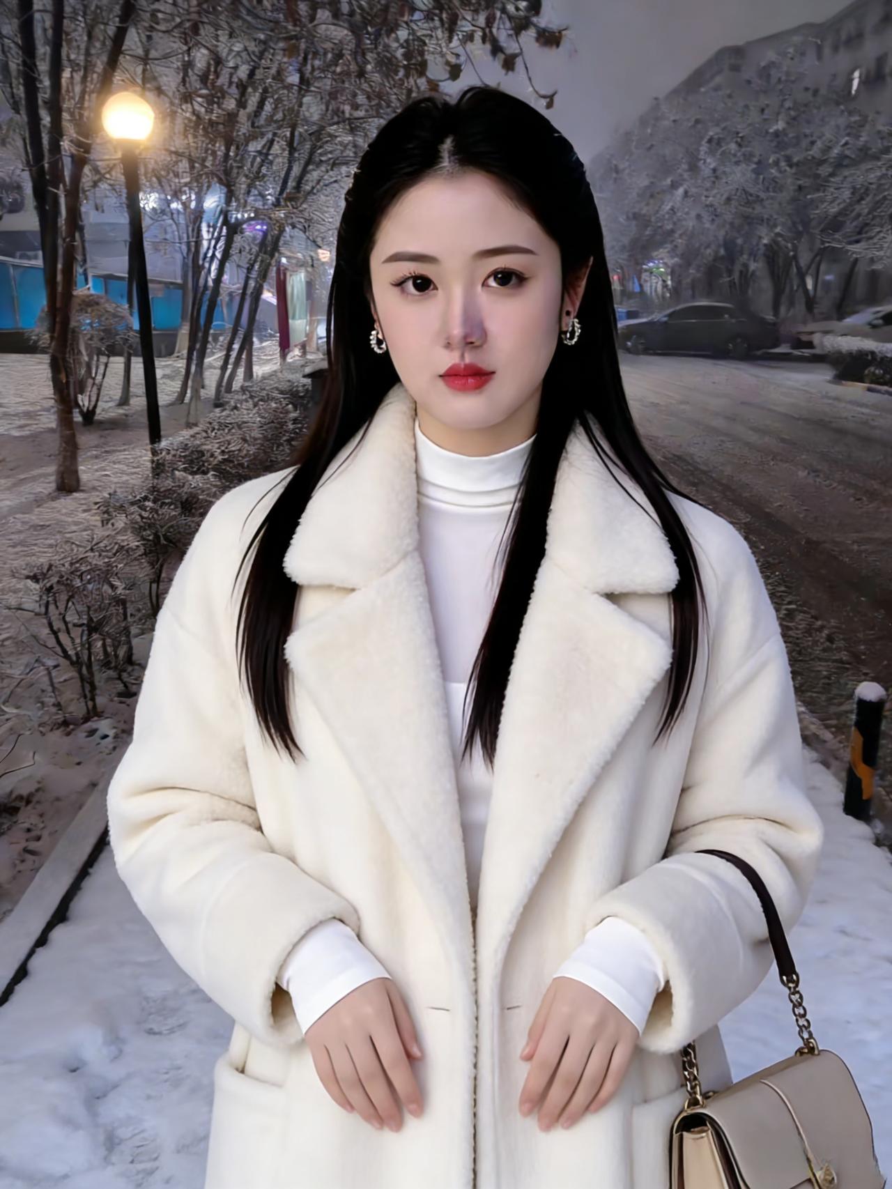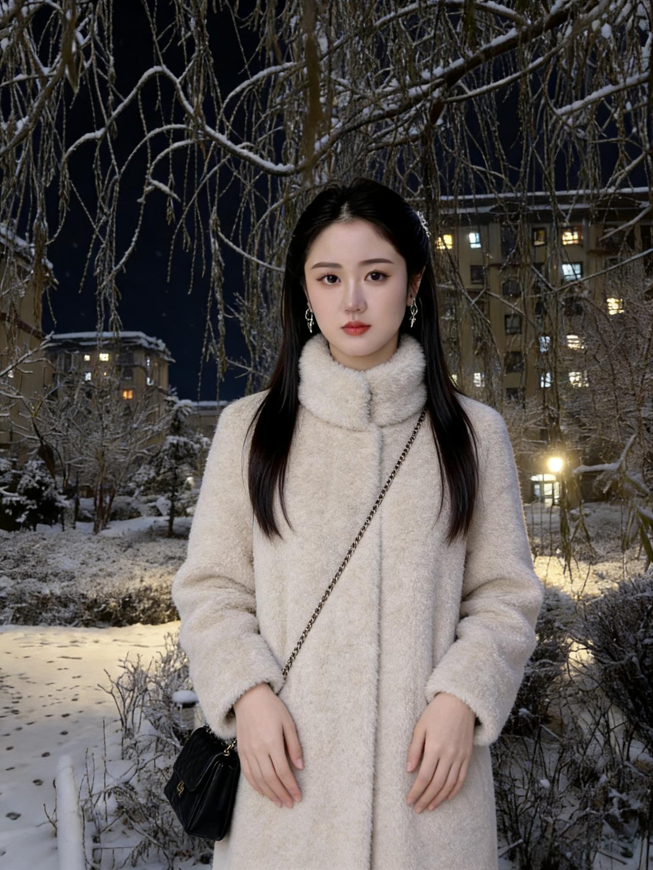 雪压寒枝夜渐深,街灯如豆暖行人。 绒衣漫裹三分冷,素面轻凝一寸春。 眉黛远,笑痕新,无端惊起客中魂。 归来枕上清宵梦,犹带衣香与雪痕。