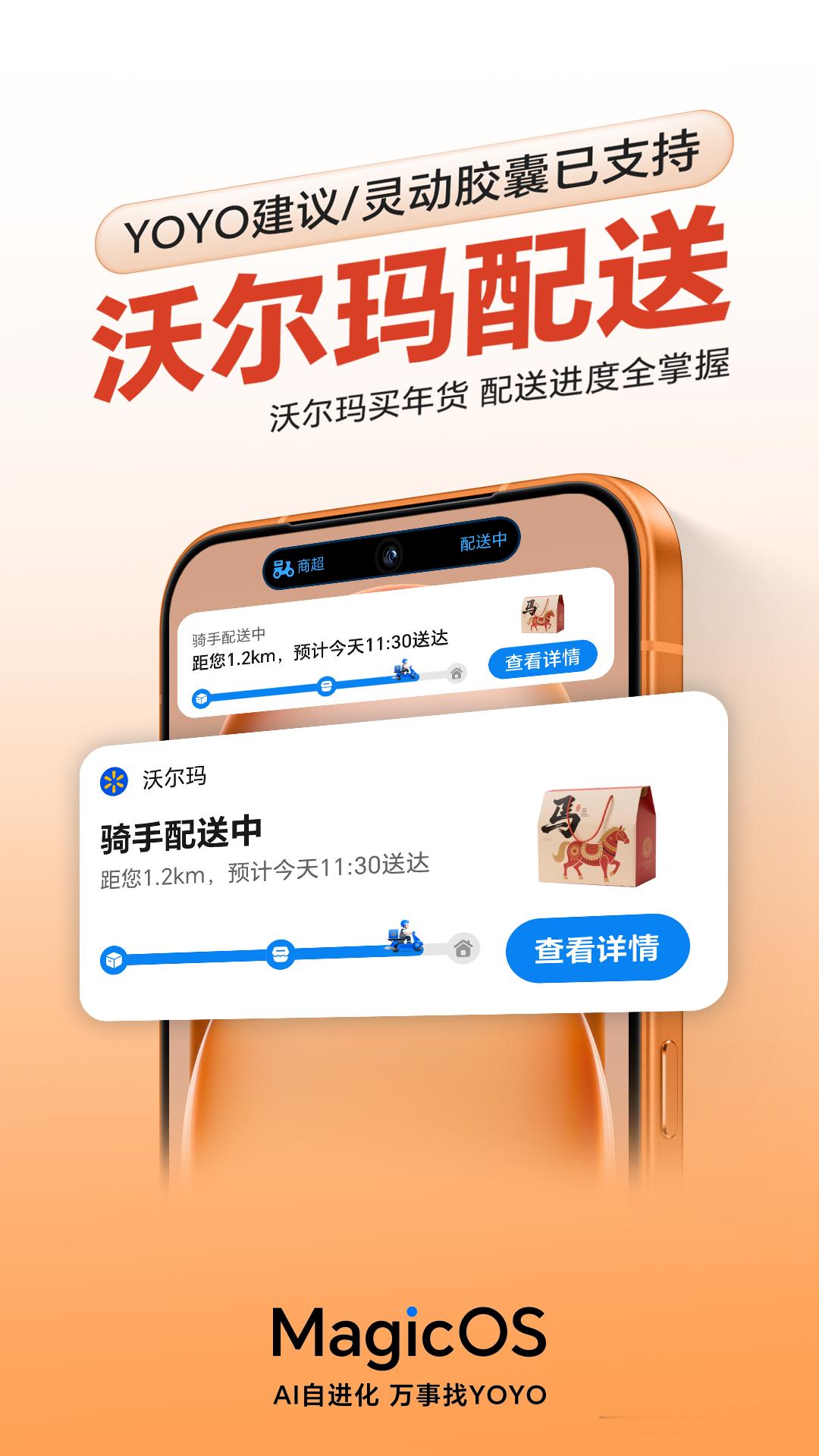 MagicOS月月新万事找YOYO 年货采购不用愁!在沃尔玛APP购物,YOYO建议和灵动胶囊这对超强组合闪亮登场,秒变你的专属配送小雷达!当你下极速达/准时达订单,卡片上清晰展示商品打包中、待骑手取货、配送中、配送完成等状态,配送进度一目了然。轻松置办年货,把满满的心意快速带回家,开启欢乐年货时光~