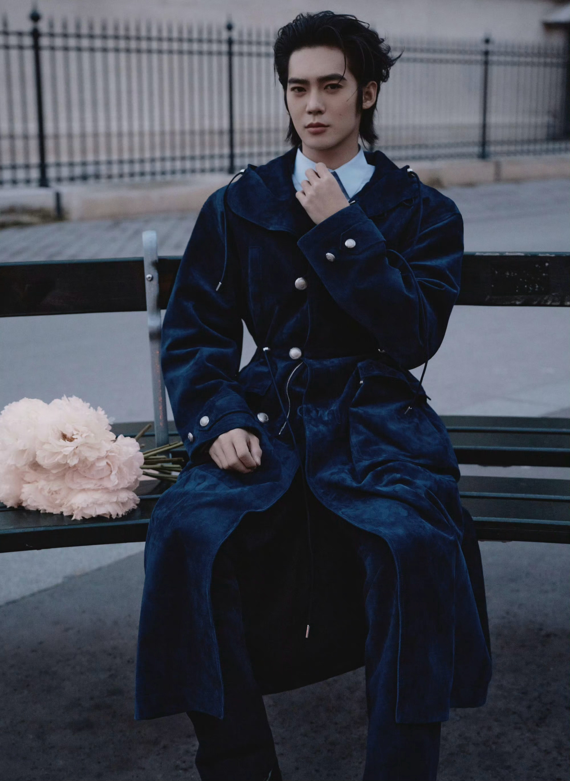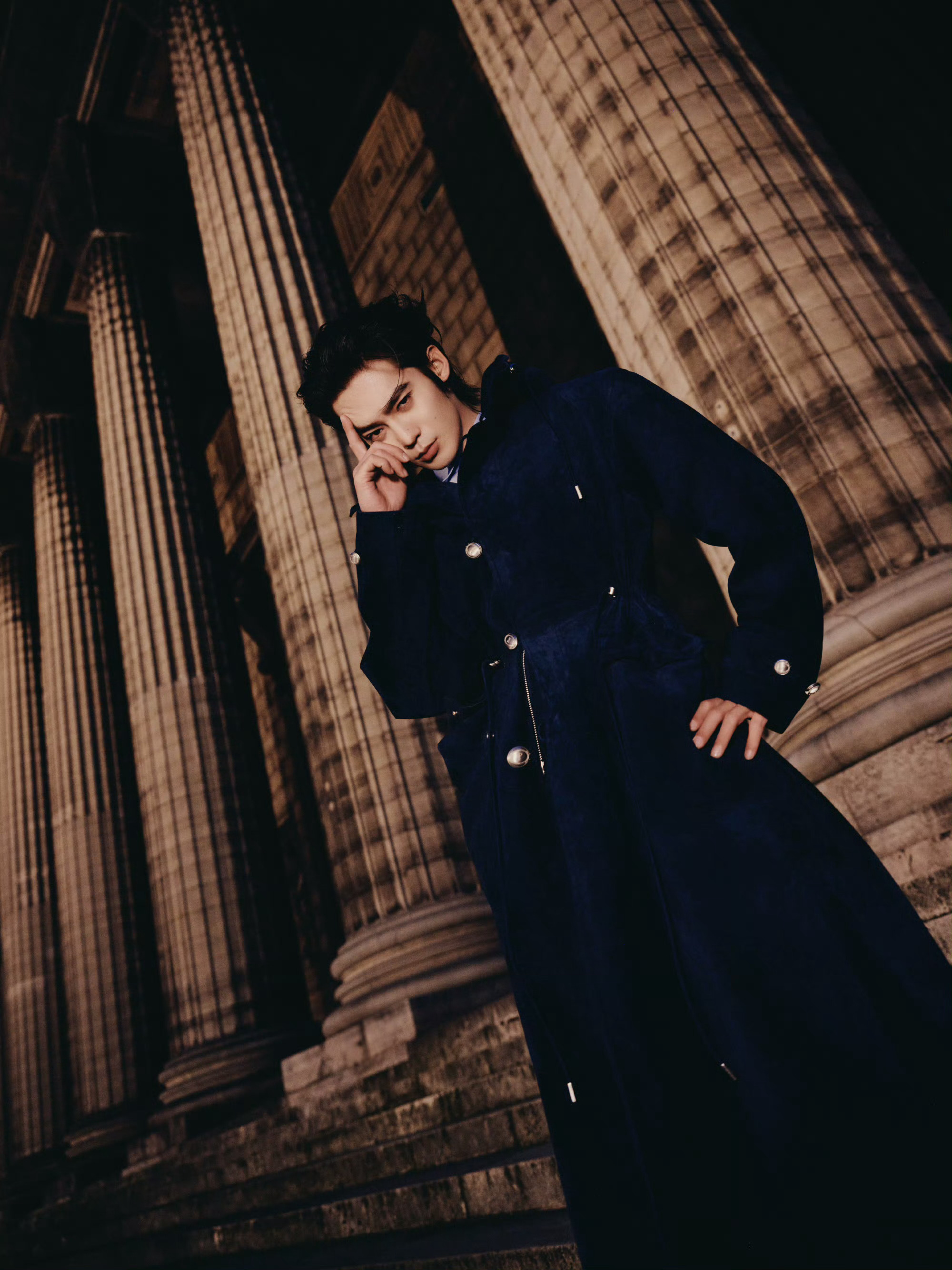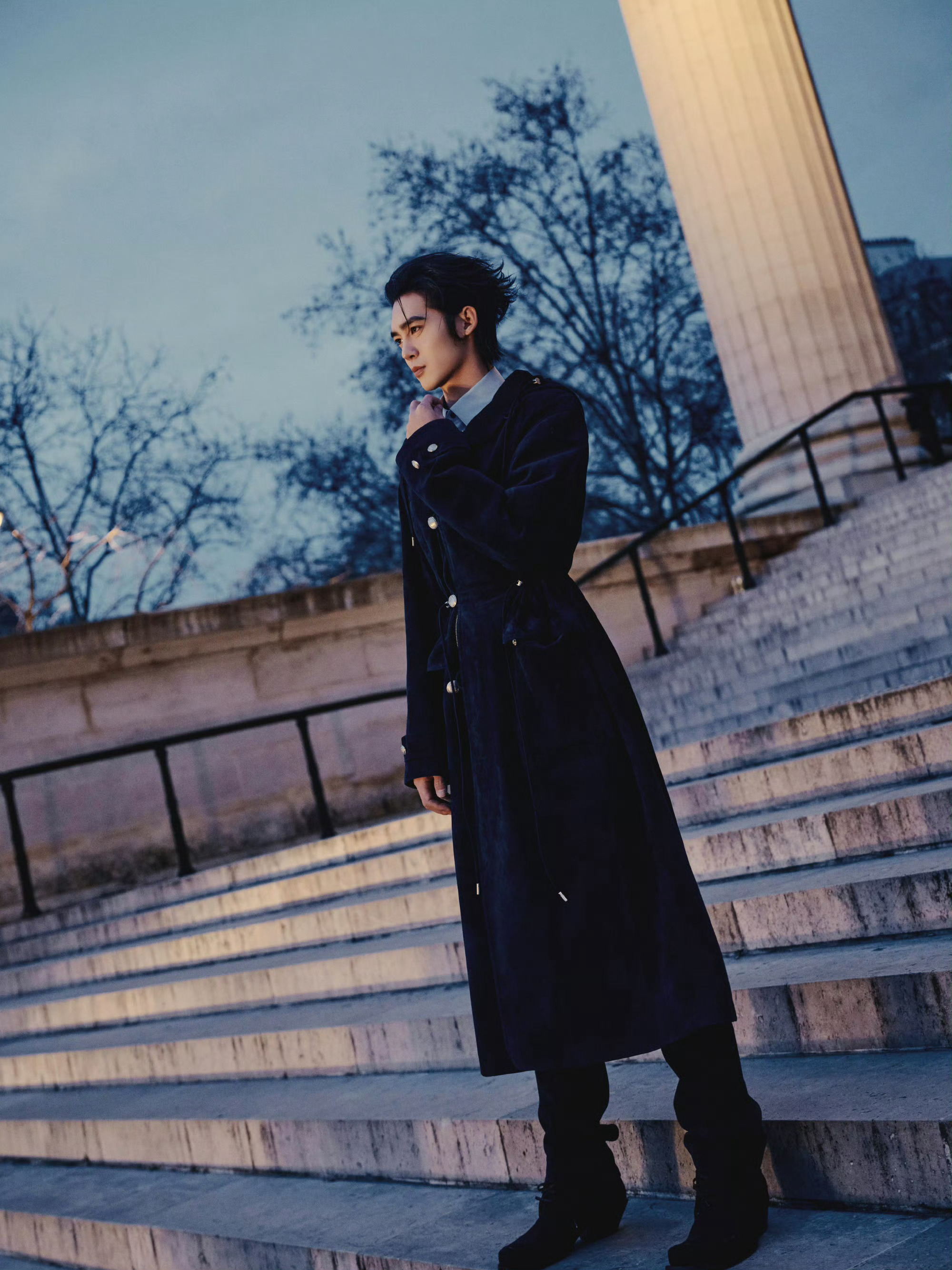 于适 今晚 DIOR大秀 造型大片,修长的大衣、利落的背头… 优雅与硬朗并存,于巴黎街头的浪漫邂逅,上演一段异国蓝调恋曲。🌌✨ 巴黎男装周男装周