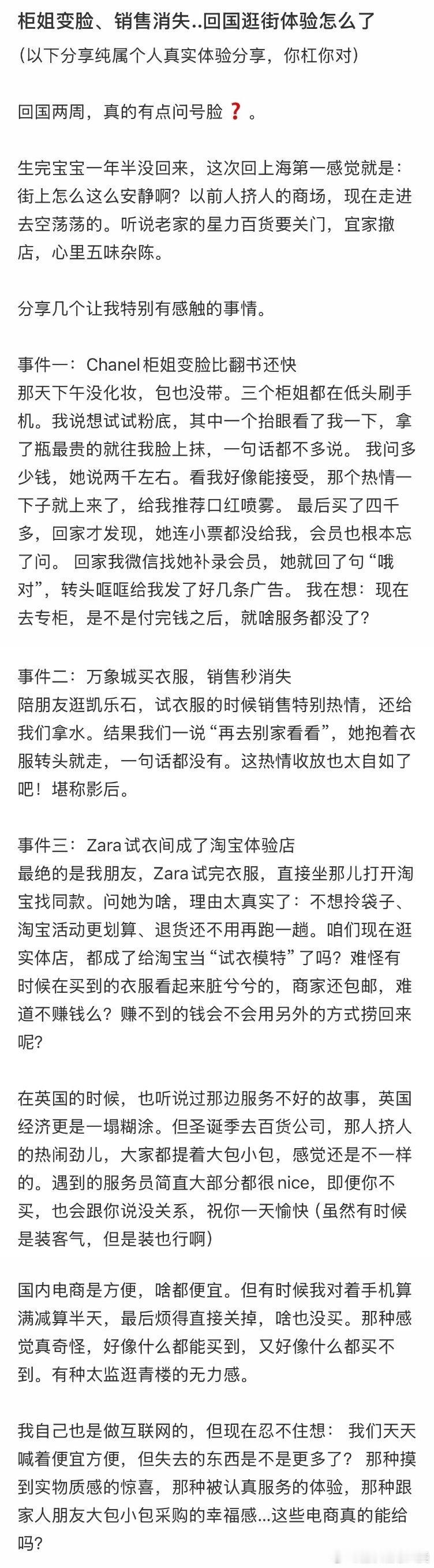 回国逛街体验变化:柜姐态度转变,销售消失。