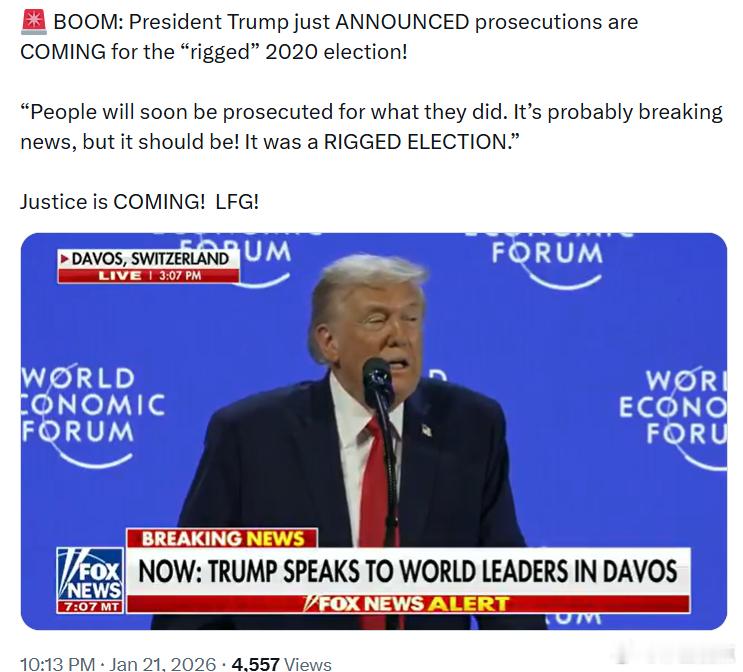 特朗普总统刚刚宣布:针对“被操纵”的2020年大选,起诉行动即将到来!他说:“人们很快就会因为他们所做的事情而被起诉。这大概算是突发新闻,而且本来就该是!那是一场被操纵的选举。”