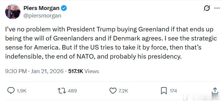皮尔斯·摩根:我对特朗普总统如果按照格陵兰人民的意愿,并且得到丹麦同意而购买格陵兰岛没有意见。我能理解这对美国的战略意义。但如果美国试图用武力夺取格陵兰岛,那就是无法辩护的行为,可能导致北约解体,也很可能意味着他的总统任期结束。