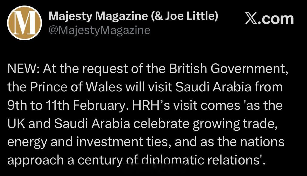 威廉王子 【预告】肯辛顿宫宣布,应外交发展办公室要求,威廉王储将于2026年2月9日至2月11日期间对沙特阿拉伯进行为期3️⃣天的访问,以庆祝双边建交将近1️⃣0️⃣0️⃣周年🇸🇦