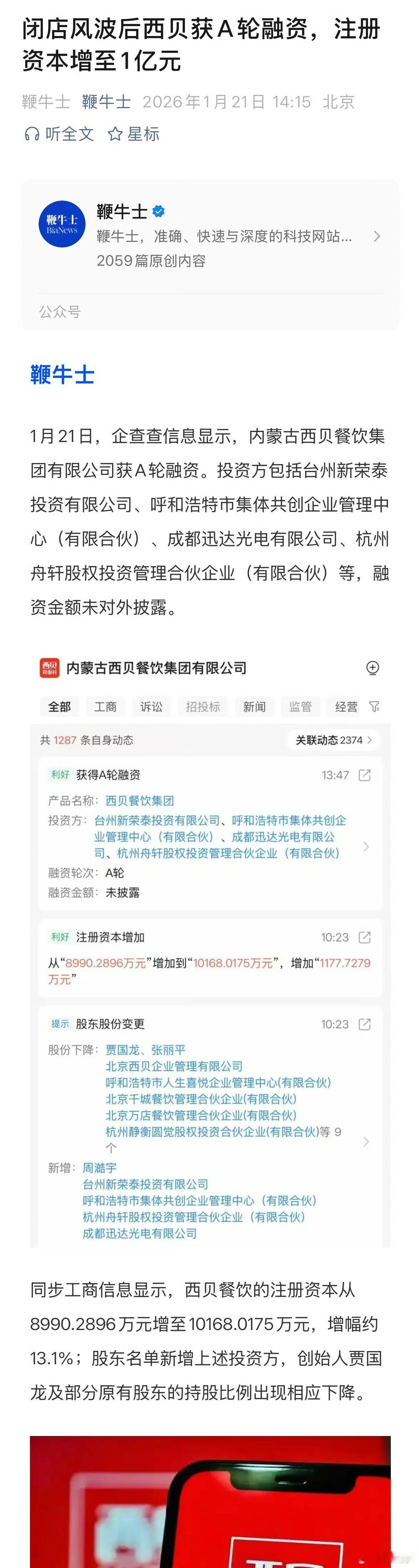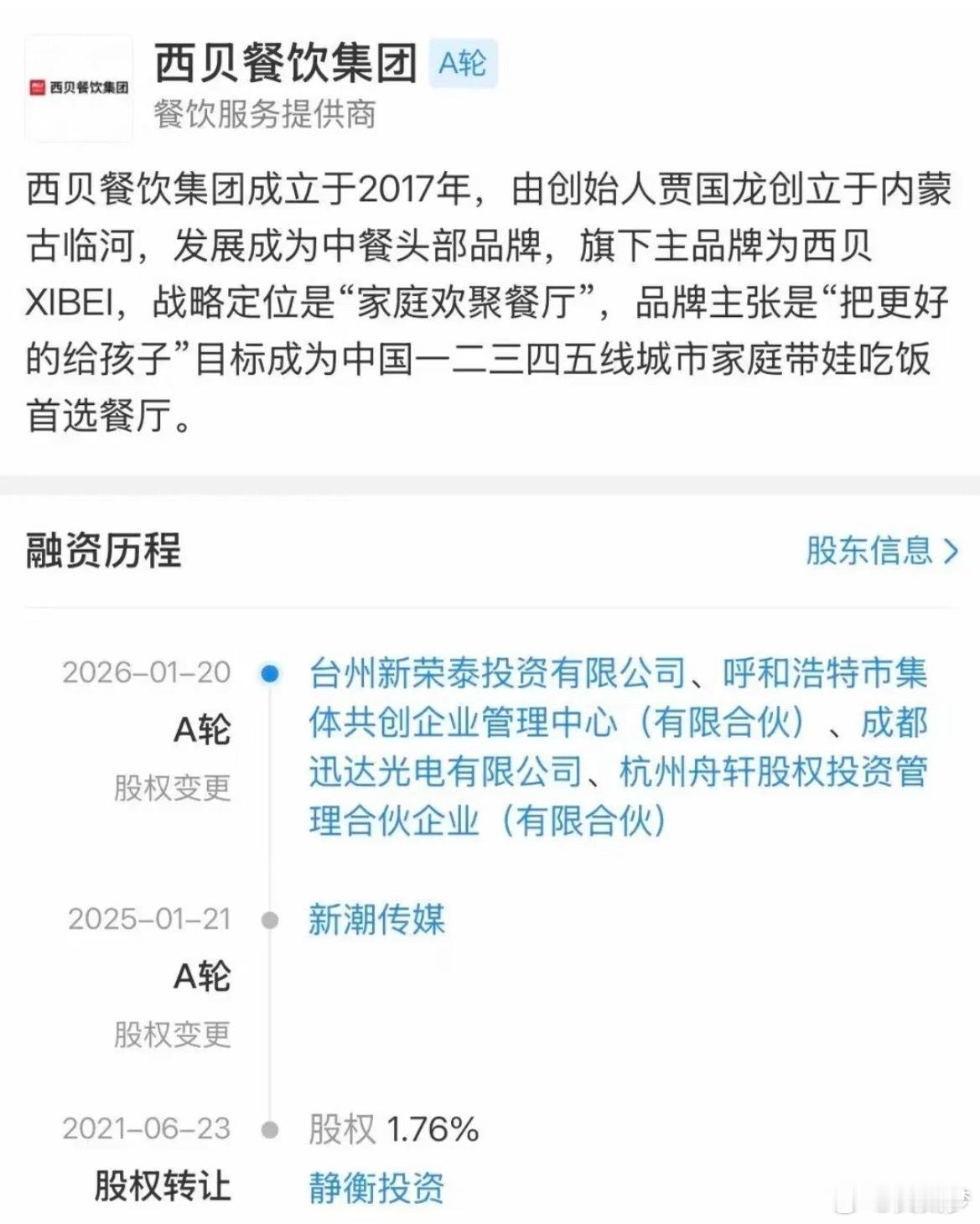 西贝获得A轮融资,说是融资,更像是餐饮业的人在伸手救西贝有新荣记的张勇、和蚂蚁前CEO胡晓明等增资,贾国龙股权从89%降至26%西贝集团增资西贝集团增资至1.02亿