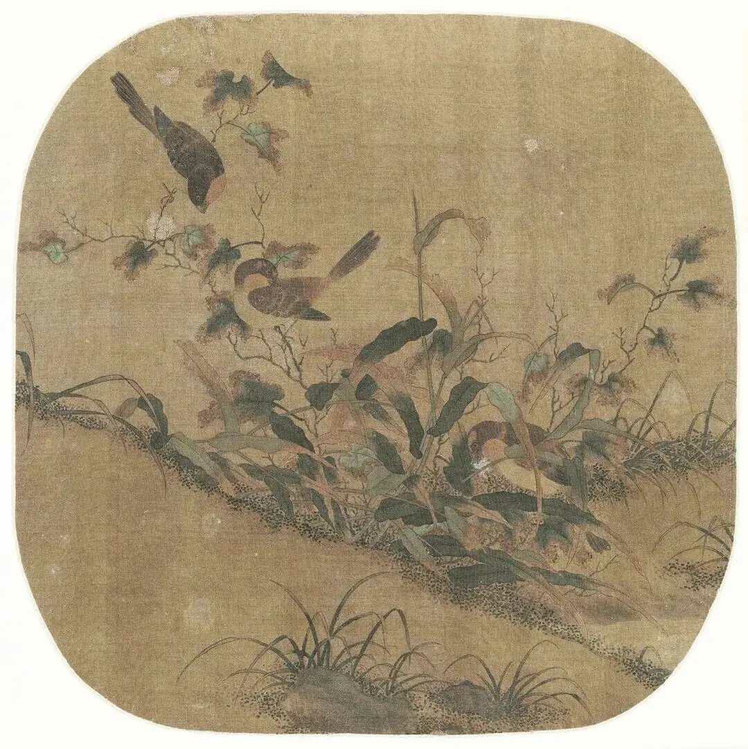 南宋佚名《群雁图》,一群野雁挤在芦苇丛边,有的低头啄食,有的扑棱翅膀,远处还有
