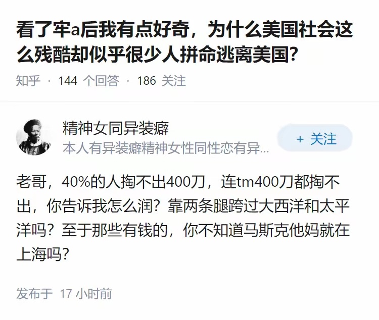 网友:看了牢a后我有点好奇,为什么美国社会这么残酷却似乎很少人拼命逃离美国?