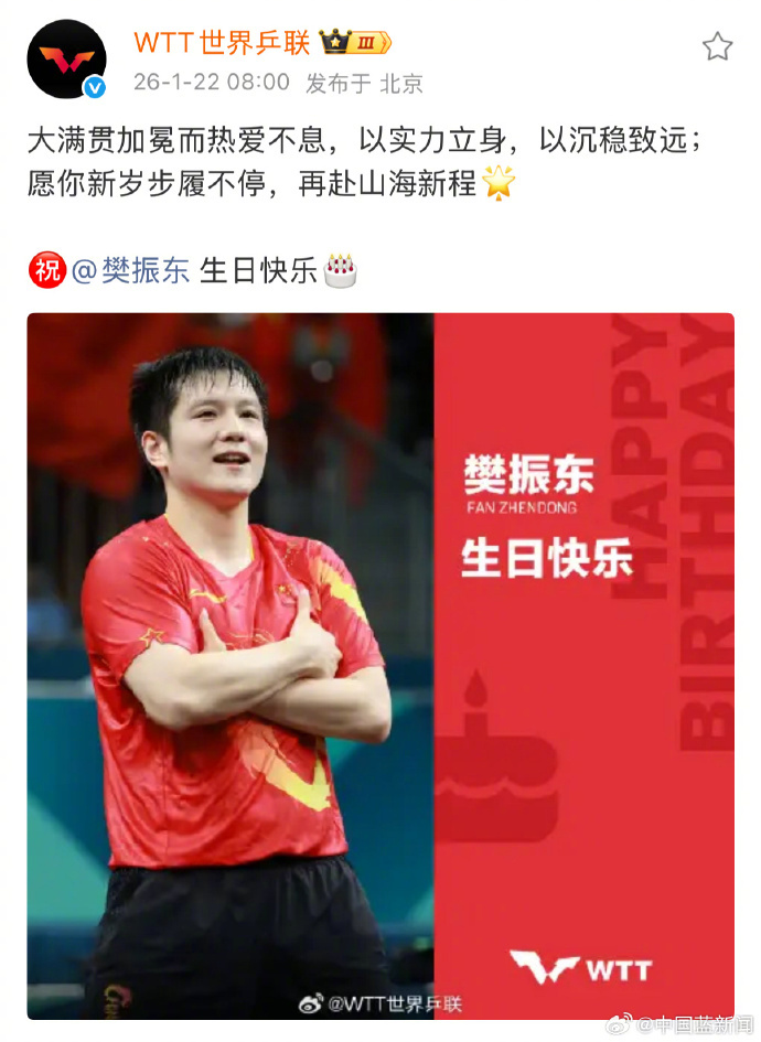 【#WTT祝樊振东生日快乐#】今天是乒乓球运动员的生日,发博祝福樊振东生日快乐!#WTT祝樊振东新岁步履不停##樊振东29岁115冠#